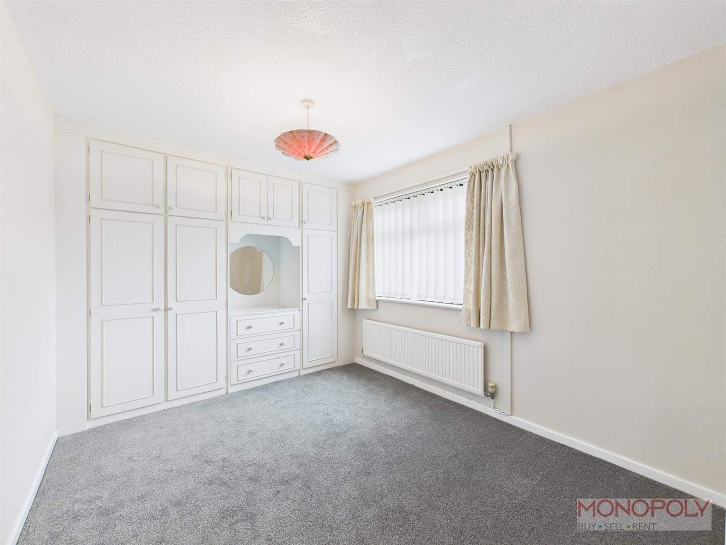 Window to the front, fitted wardrobes, drawers and storage units, radiator and carpet flooring.