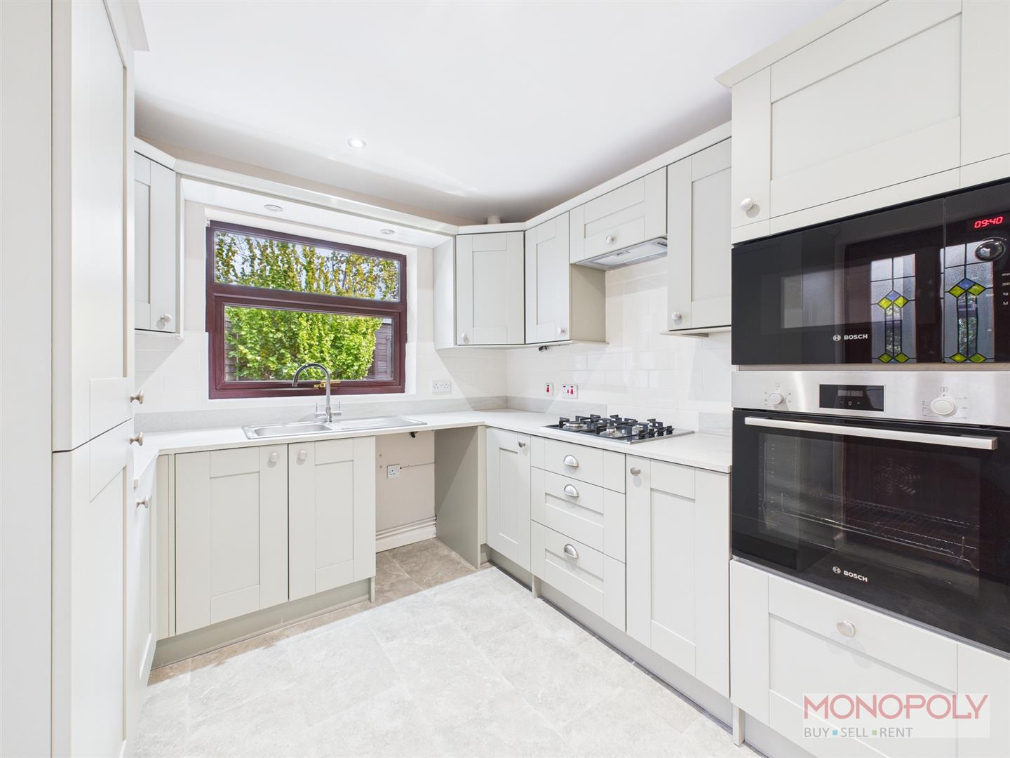 A modern kitchen housing a range of shaker-style wall, drawer and base units with complementary worktop over featuring a stainless steel sink drainer unit with mixer tap over and tiled splashback. Integrated appliances to include a stainless steel Bosch oven with Bosch microwave above, stainless steel Bosch gas hob with extractor fan over and fridge freezer. Space and plumbing for washing machine below the sink. Window to rear, leaded and stained-glass door leads into the conservatory. Cupboard housing boiler.