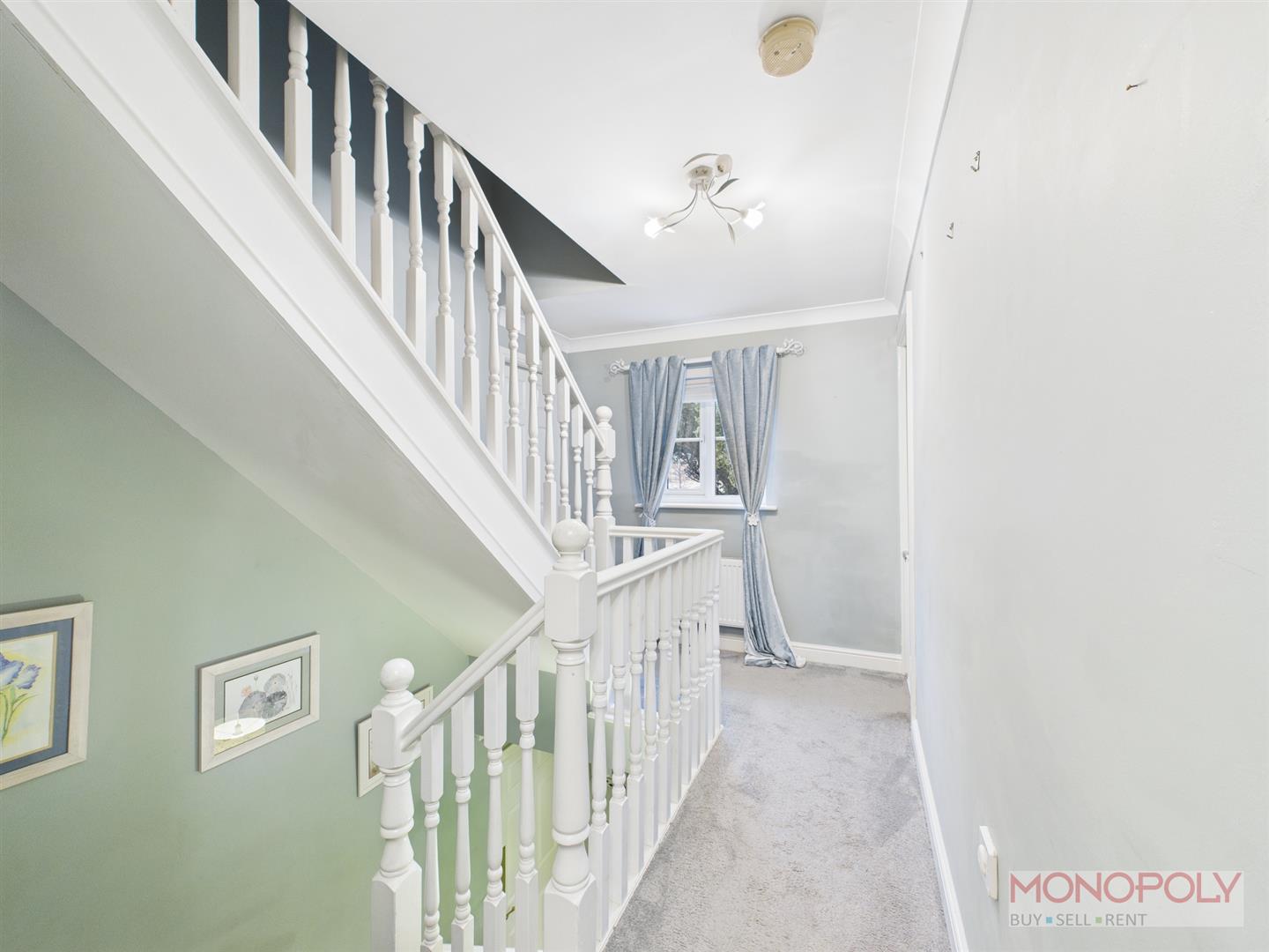 Carpet flooring, cupboard housing hot water tank, doors off to bedrooms and bathroom and stairs rising to second floor.