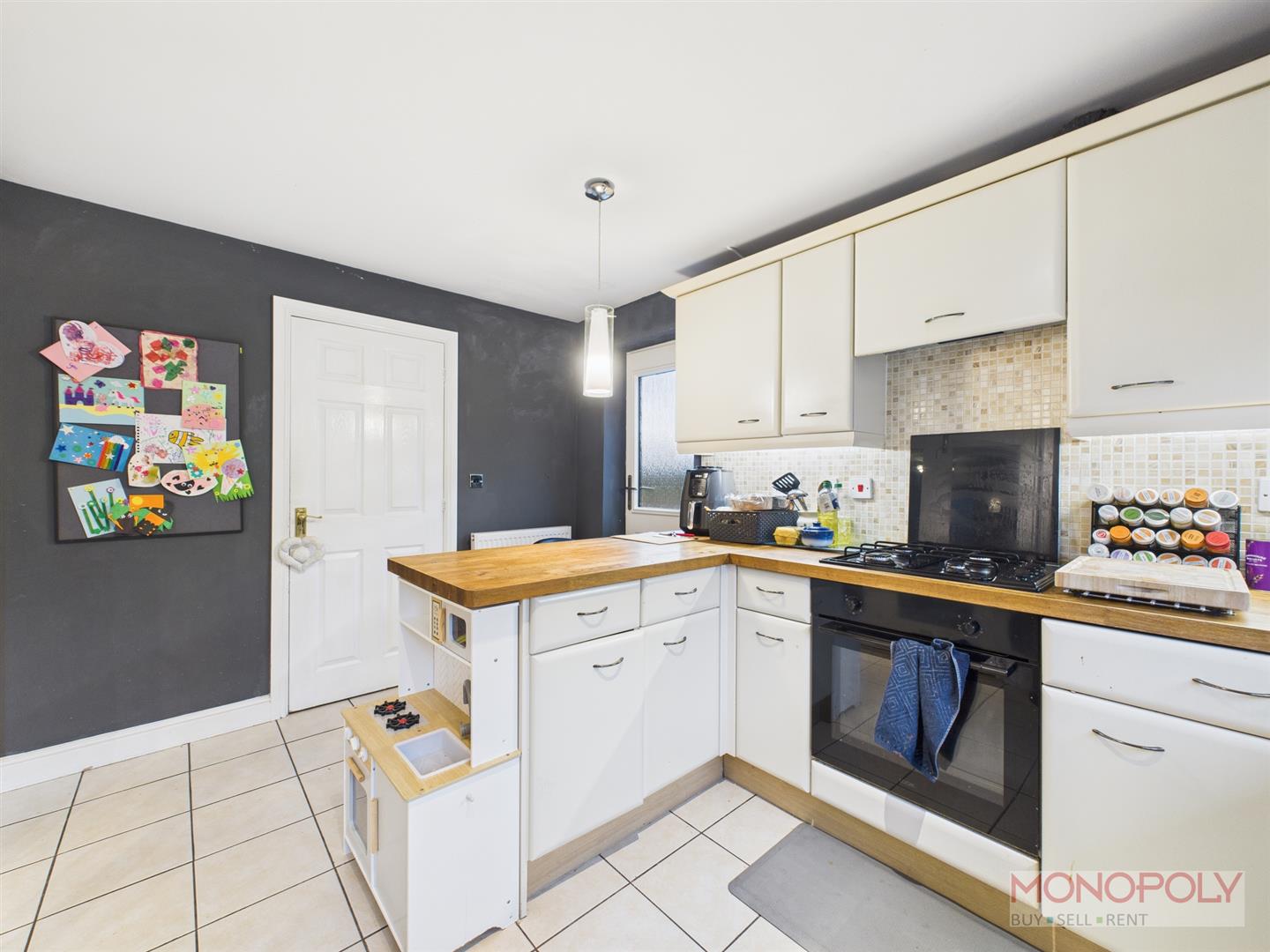 Useful utility space with marble effect worktops, space and plumbing for washing machine and tumble dryer. UPVC Double glazed window to the side.