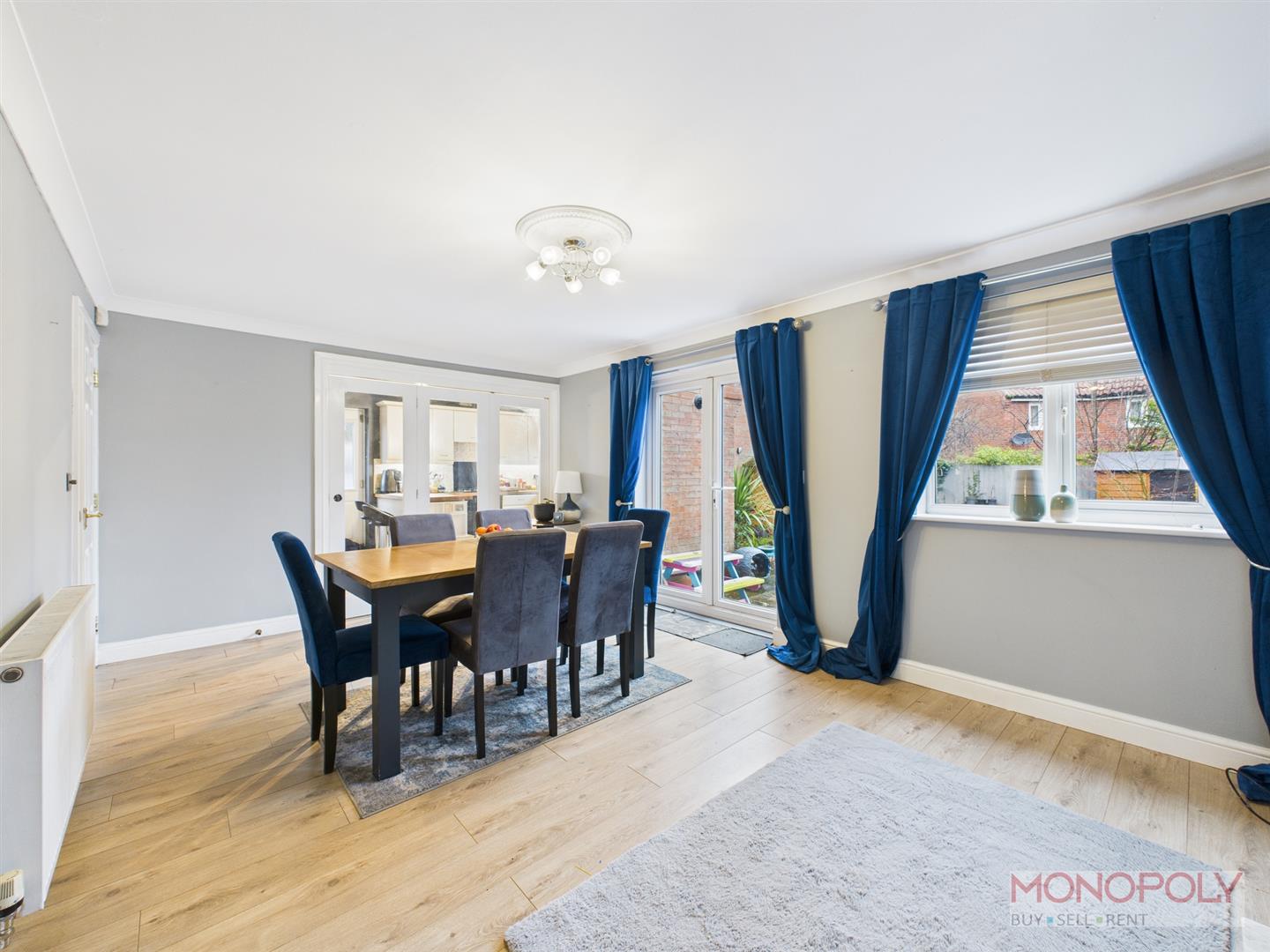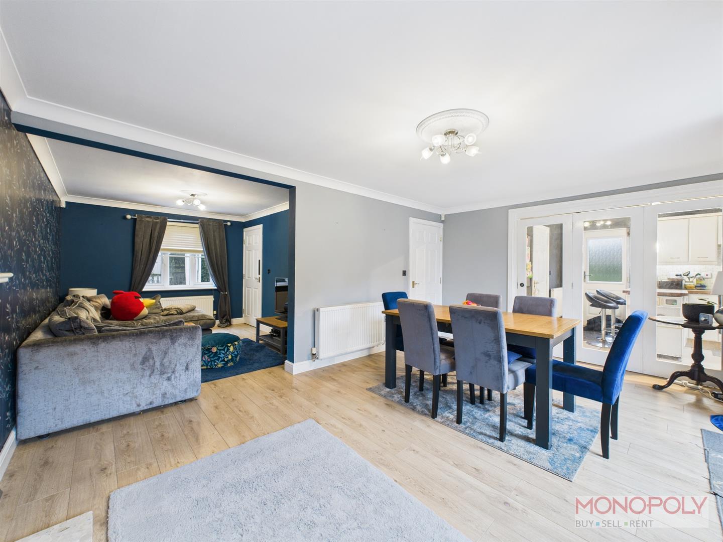 Open dining area with French doors and window to the rear, electric fireplace with marble hearth and wooden surround. Laminate wood effect flooring. Opening into lounge.