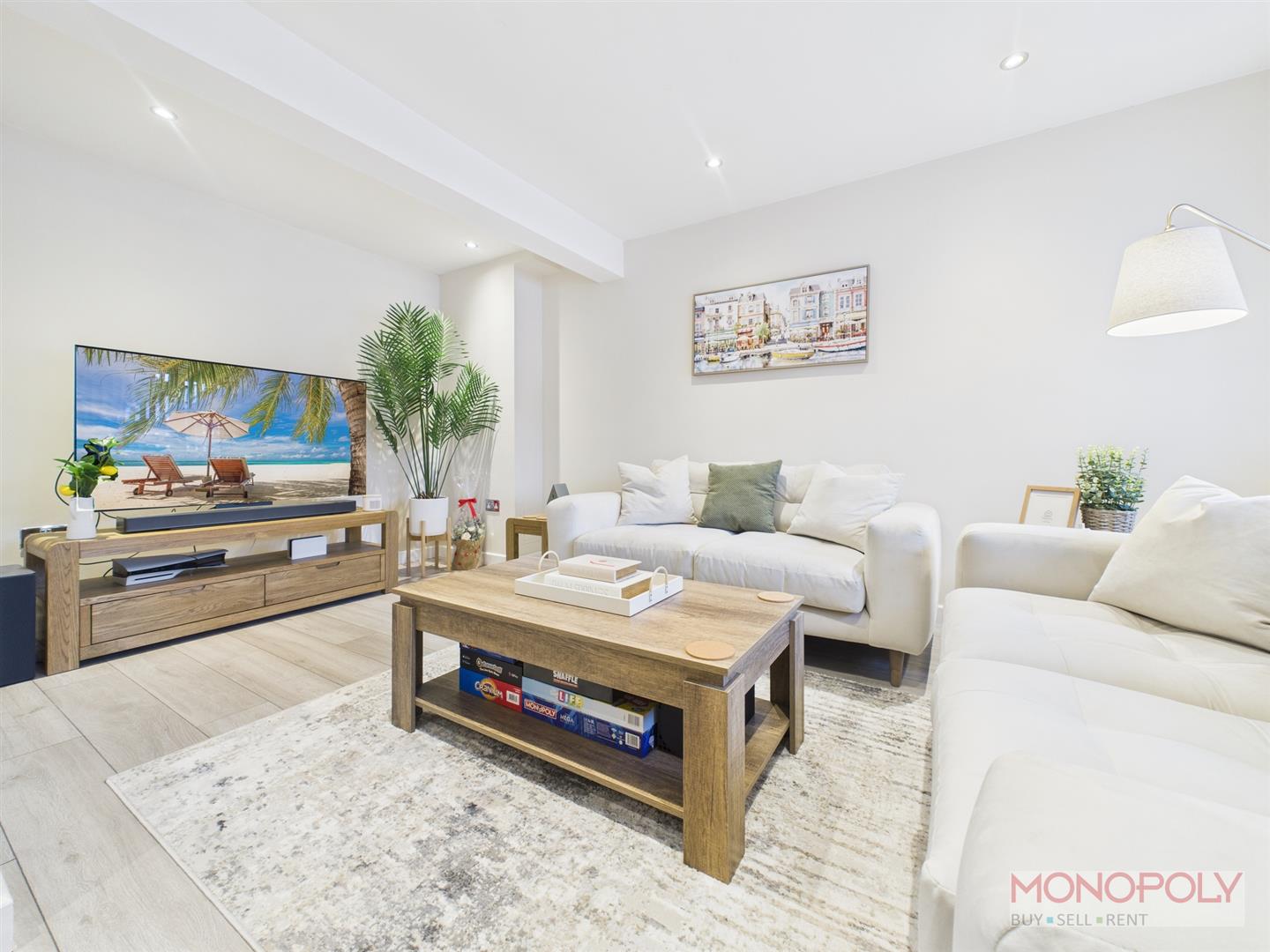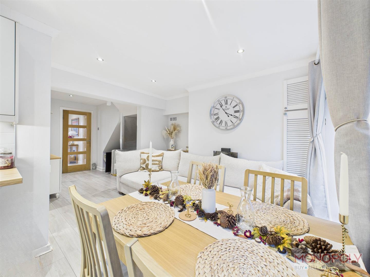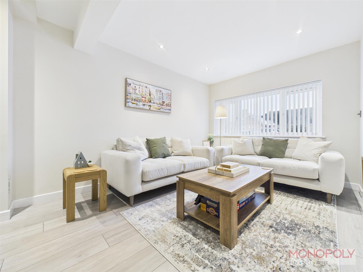 Spacious 'L' shaped living room with uPVC double glazed window to the front with vertical blinds. Wooden laminate flooring, panelled radiator, recessed LED lighting, door into inner hallway and door into kitchen/dining sitting room area.