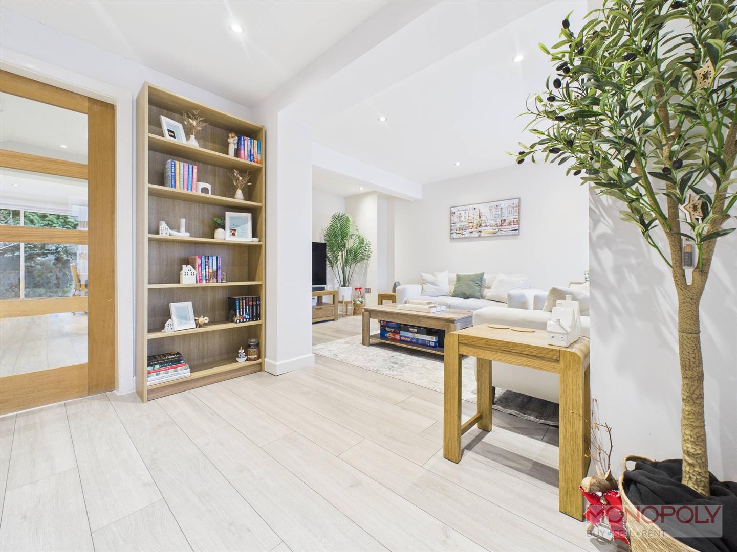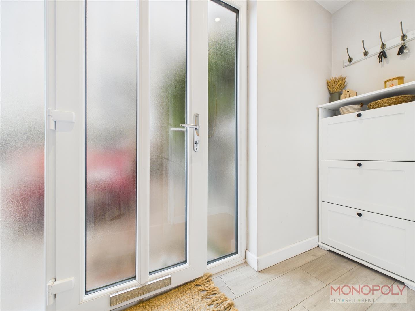 UPVC double glazed door and frosted side panels lead into entrance porch with wooden laminate flooring, recessed LED lighting and hardwood glazed door into living room.