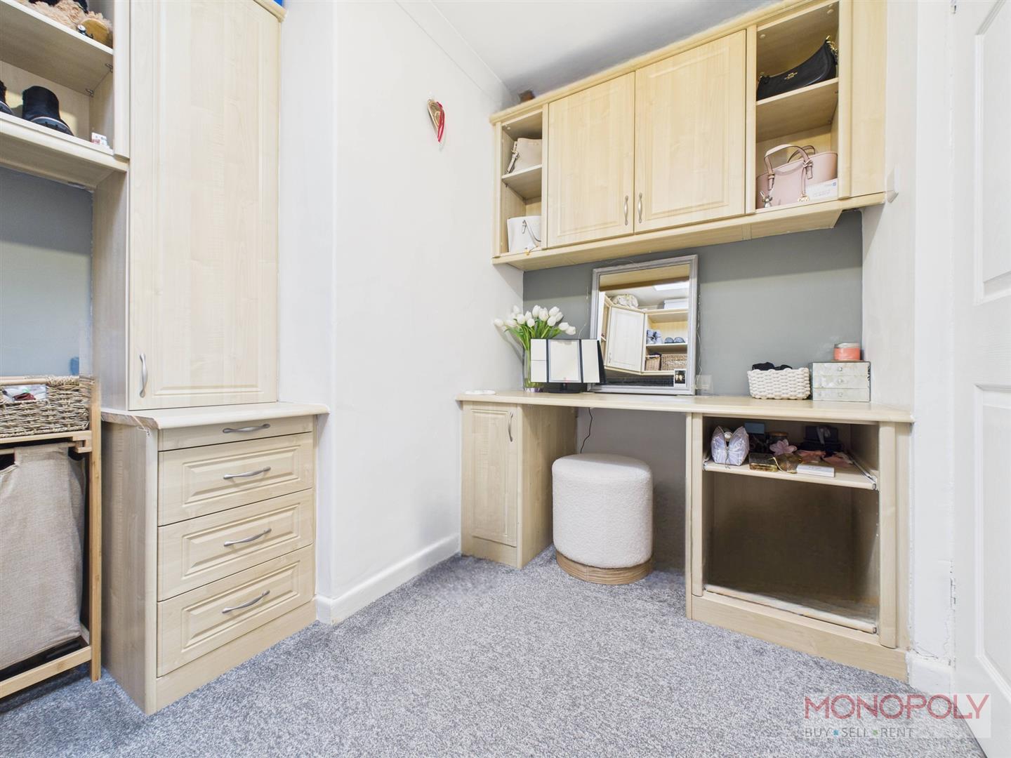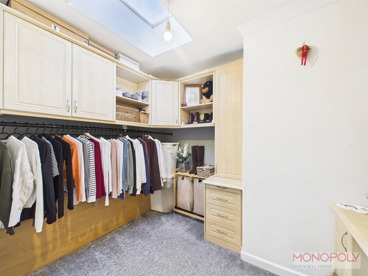 Housing a range of built in wardrobes, cupboards and dressing table with additional clothing rail. Velux sky light, carpet flooring, ceiling light point and panelled radiator.