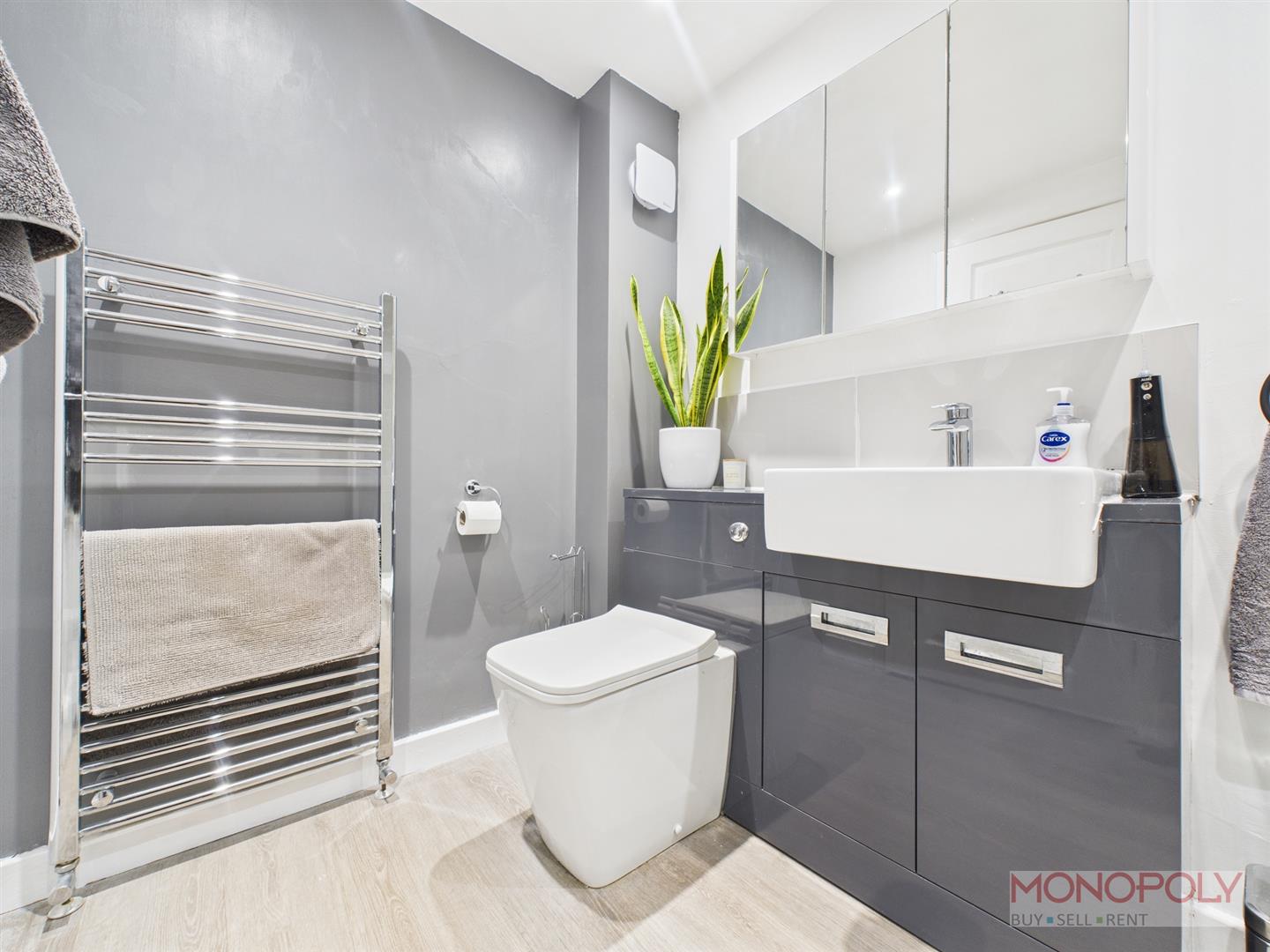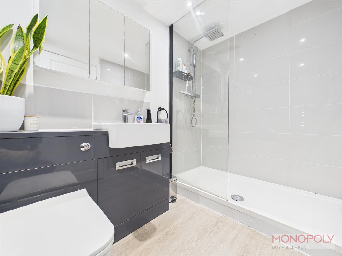 Modern three piece shower room comprising low-level WC, wash hand basin set in a concealed cistern with vanity storage and a double walk in mains shower. Wooden laminate flooring, chrome heated towel rail, extractor fan, recessed LED lighting.