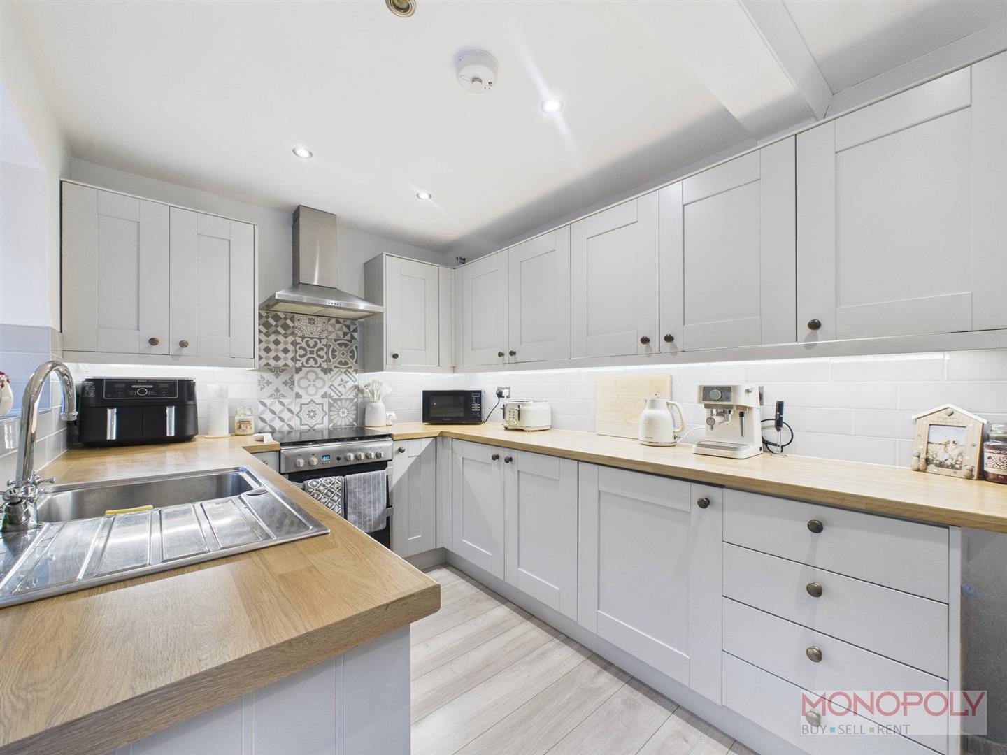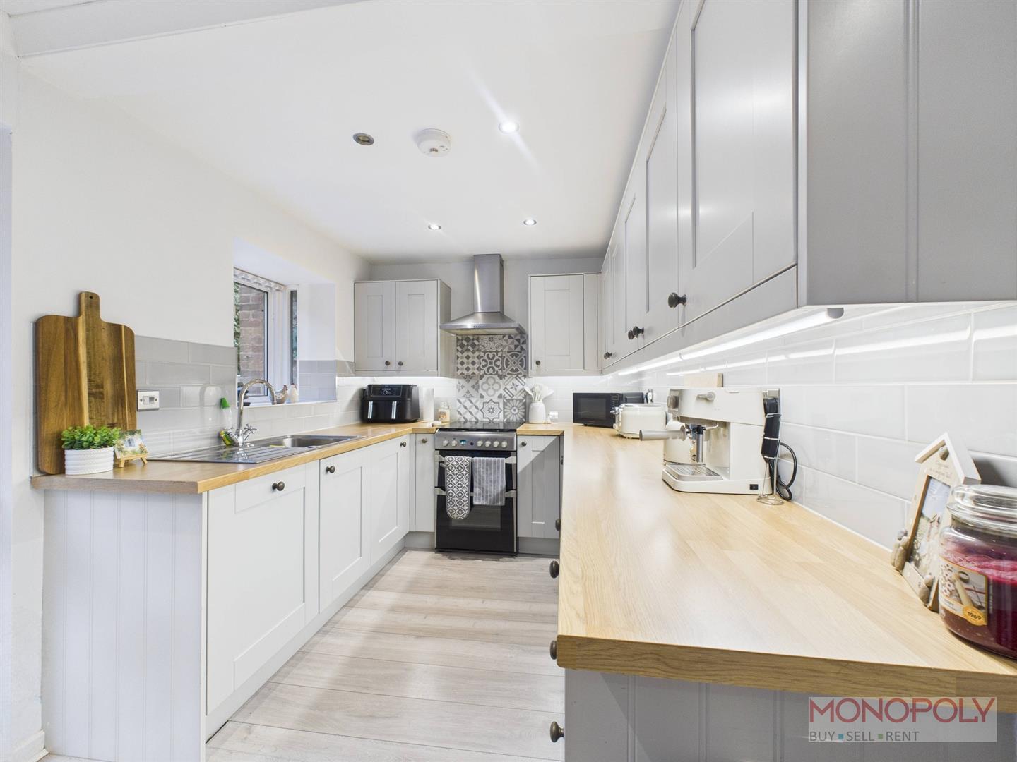 Wall and base units with work surface over. Space and plumbing for washing machine, space for tumble dryer and freezer. Vinyl flooring, recessed LED lighting, door into downstairs WC.