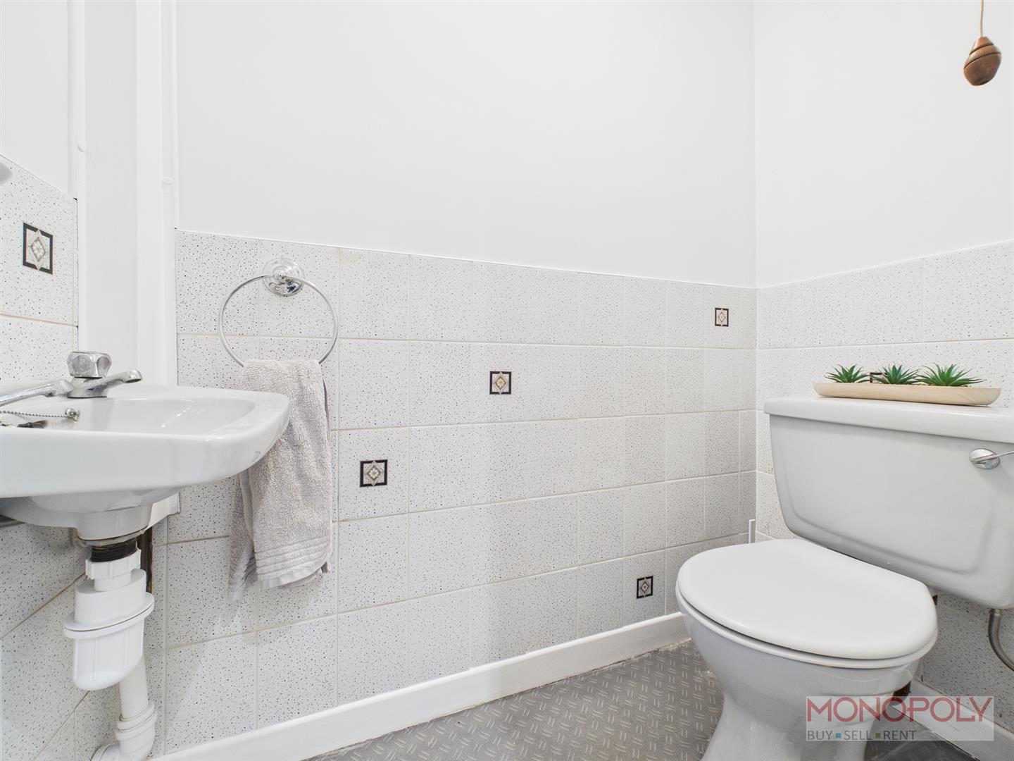 Two piece suite comprising low-level WC and wash hand basin. Vinyl flooring, recessed LED lighting and electric wall mounted heater.