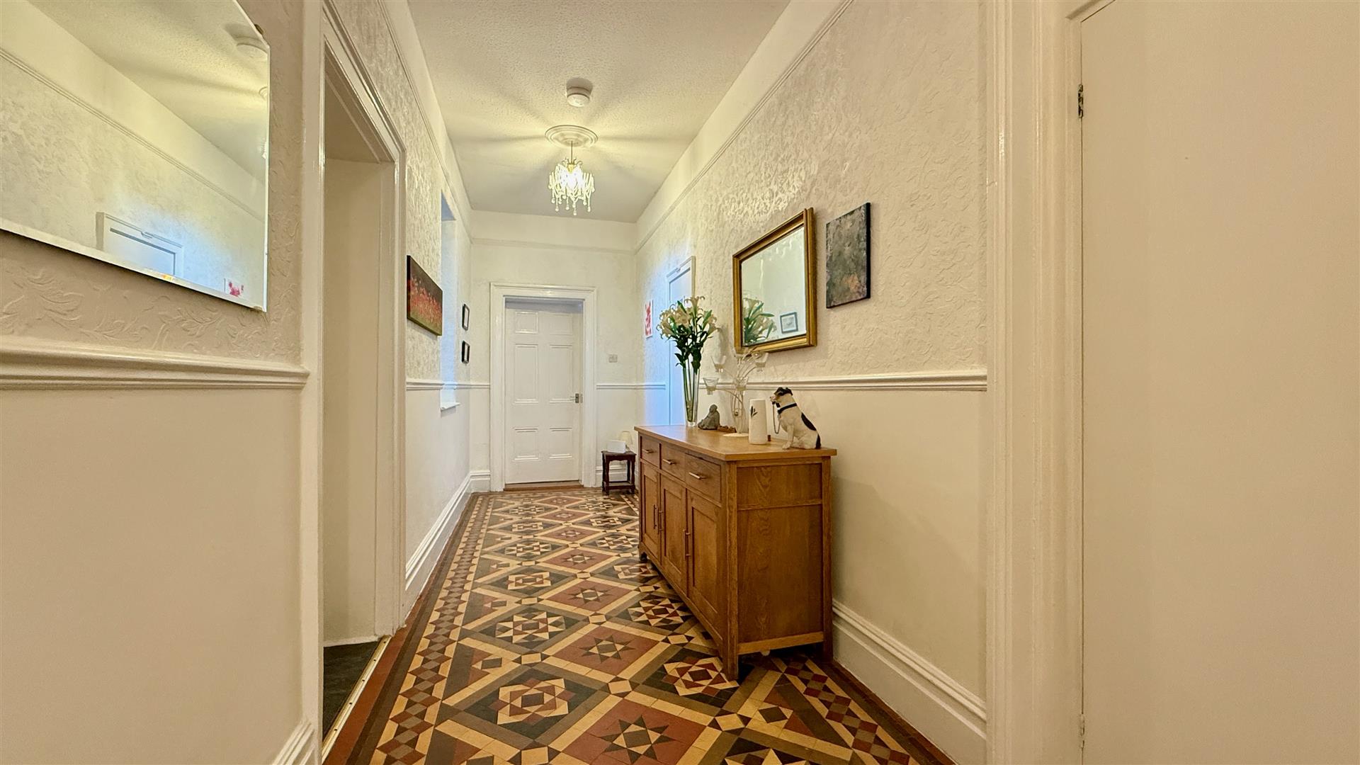 A beautiful space with Minton style tiled floor, dado and picture rails, doors off to the accommodation and large storage cupboard.