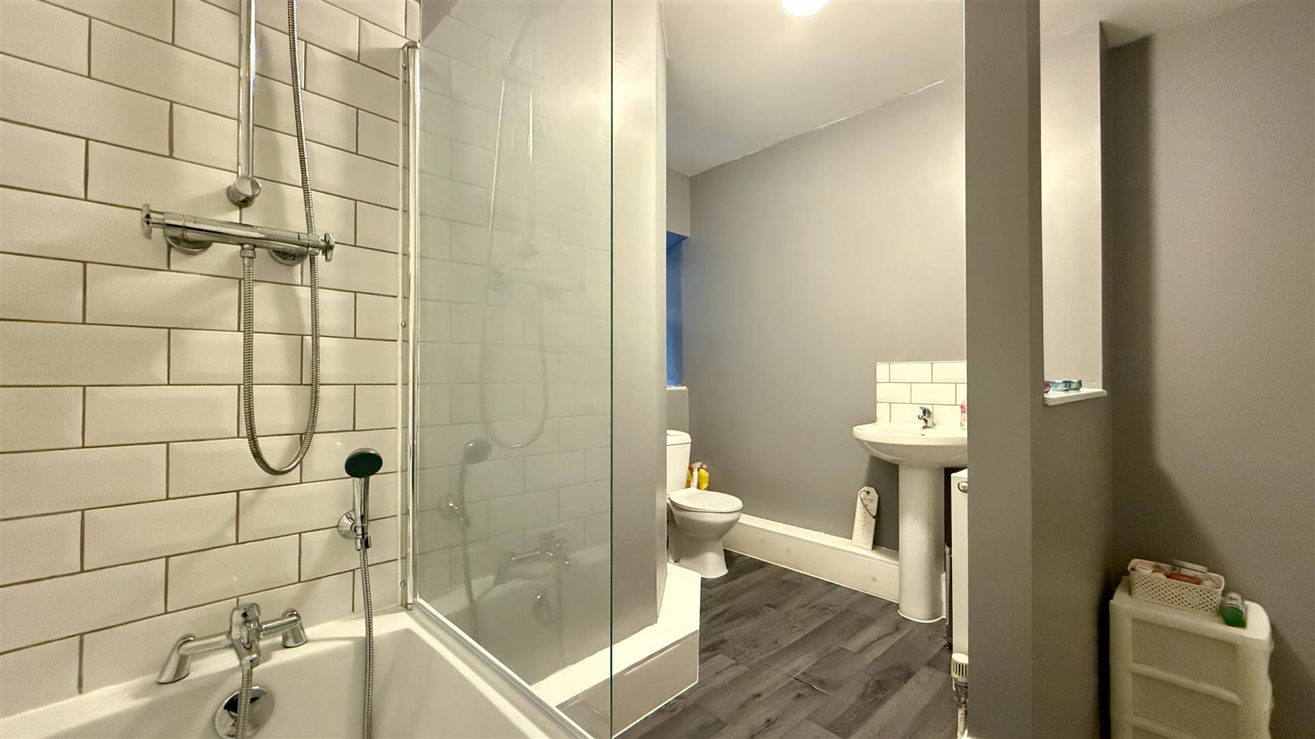 Three steps lead to the family bathroom with grey wood effect laminate flooring and contemporary part tiled walls. White suite comprising of bath with shower over, hand basin and low level WC. Window to the rear.