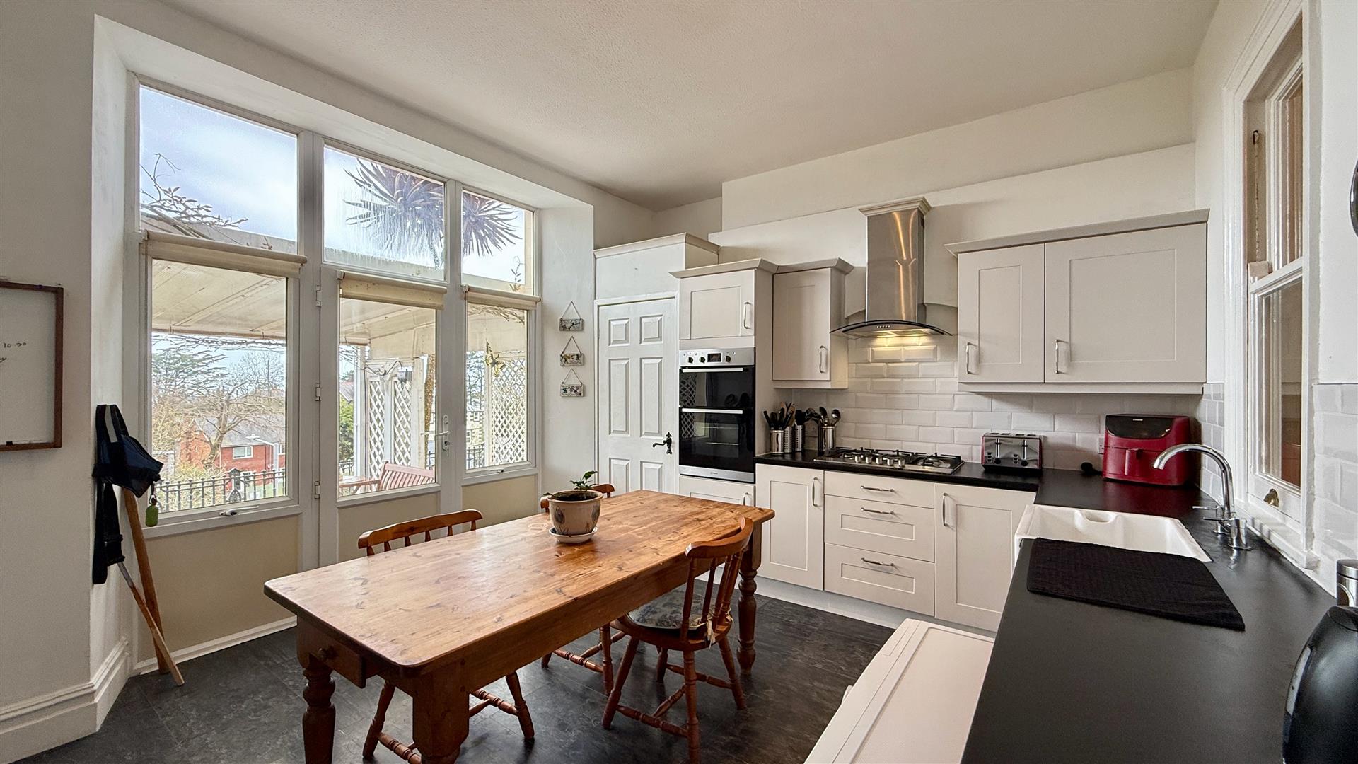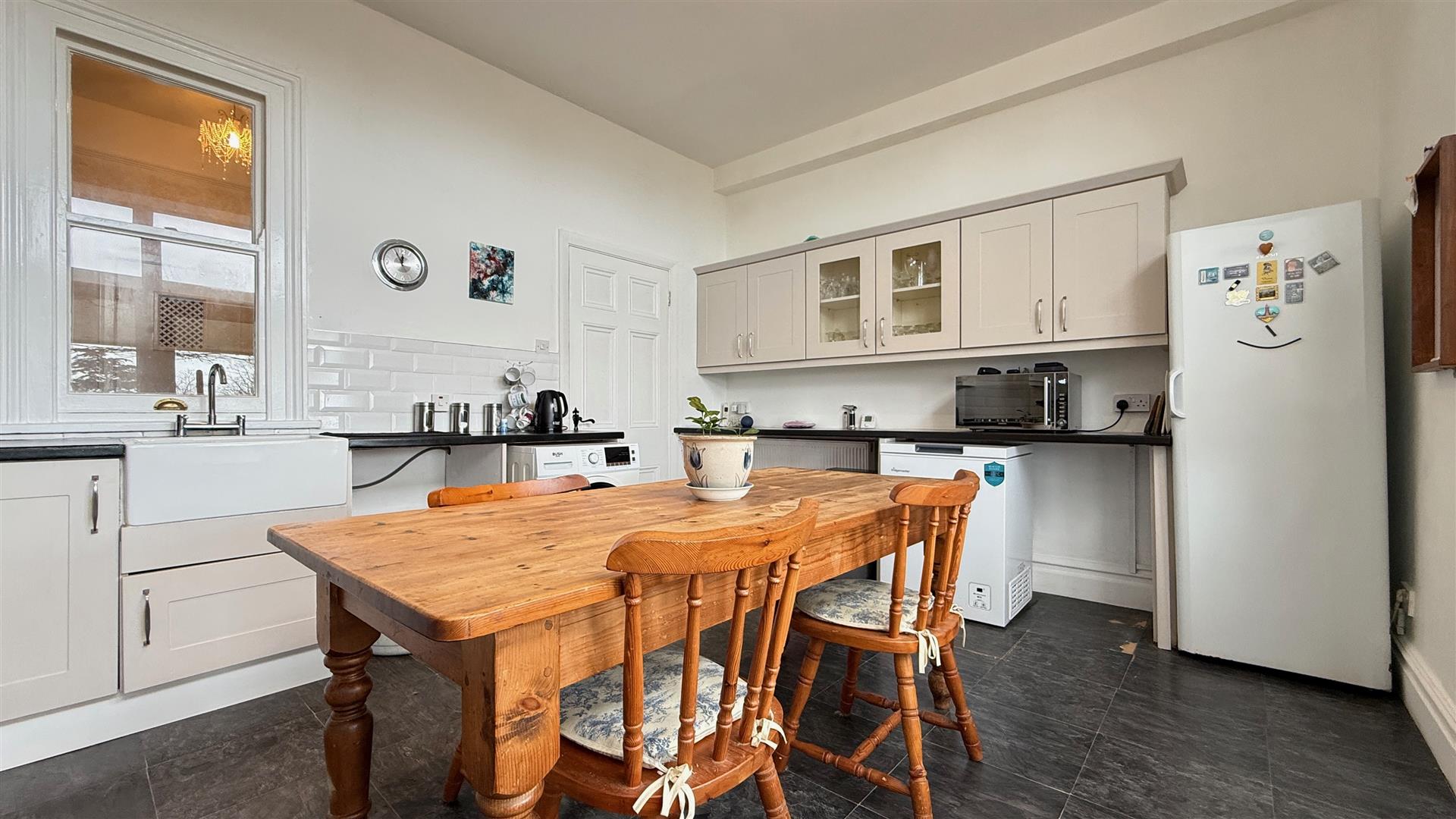 There is a range of wall and base units, built in double oven, gas hob with extractor over, space for under counter fridge, space and plumbing for washing machine and a tumble drier and space for freestanding fridge freezer. Belfast sink, contemporary splashbacks and slate effect laminate floor tiles. There is space for a dining table and chairs and a door opens to the private garden.