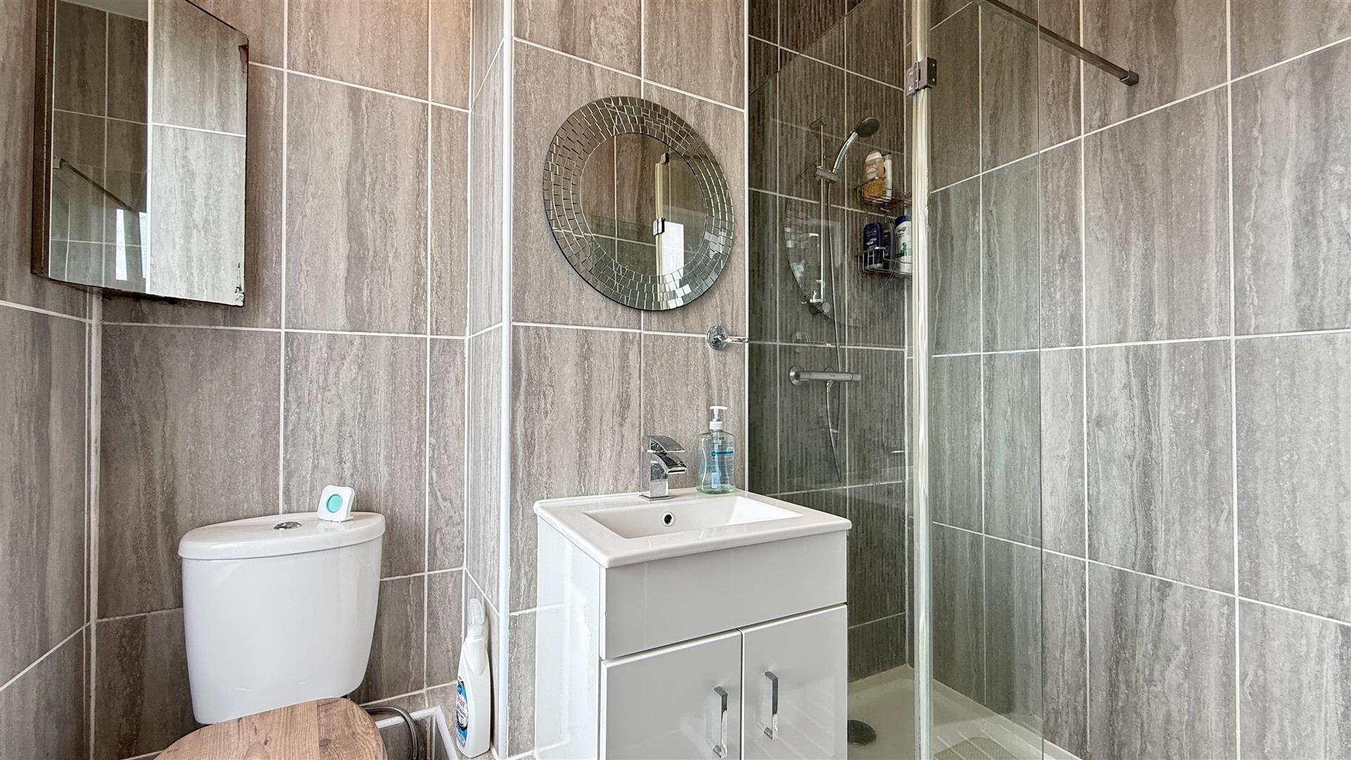Fully tiled floor and walls, white suite comprising of walk in shower, hand basin in vanity unit and low level WC. Obscure window to the front.