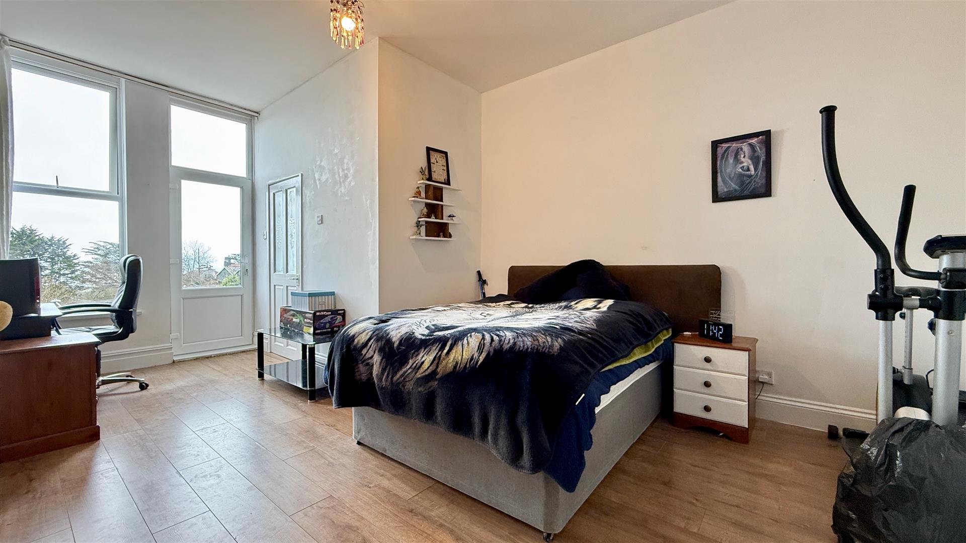 A French door leads out to the garden and the room benefits from high ceilings and wood effect laminate flooring.