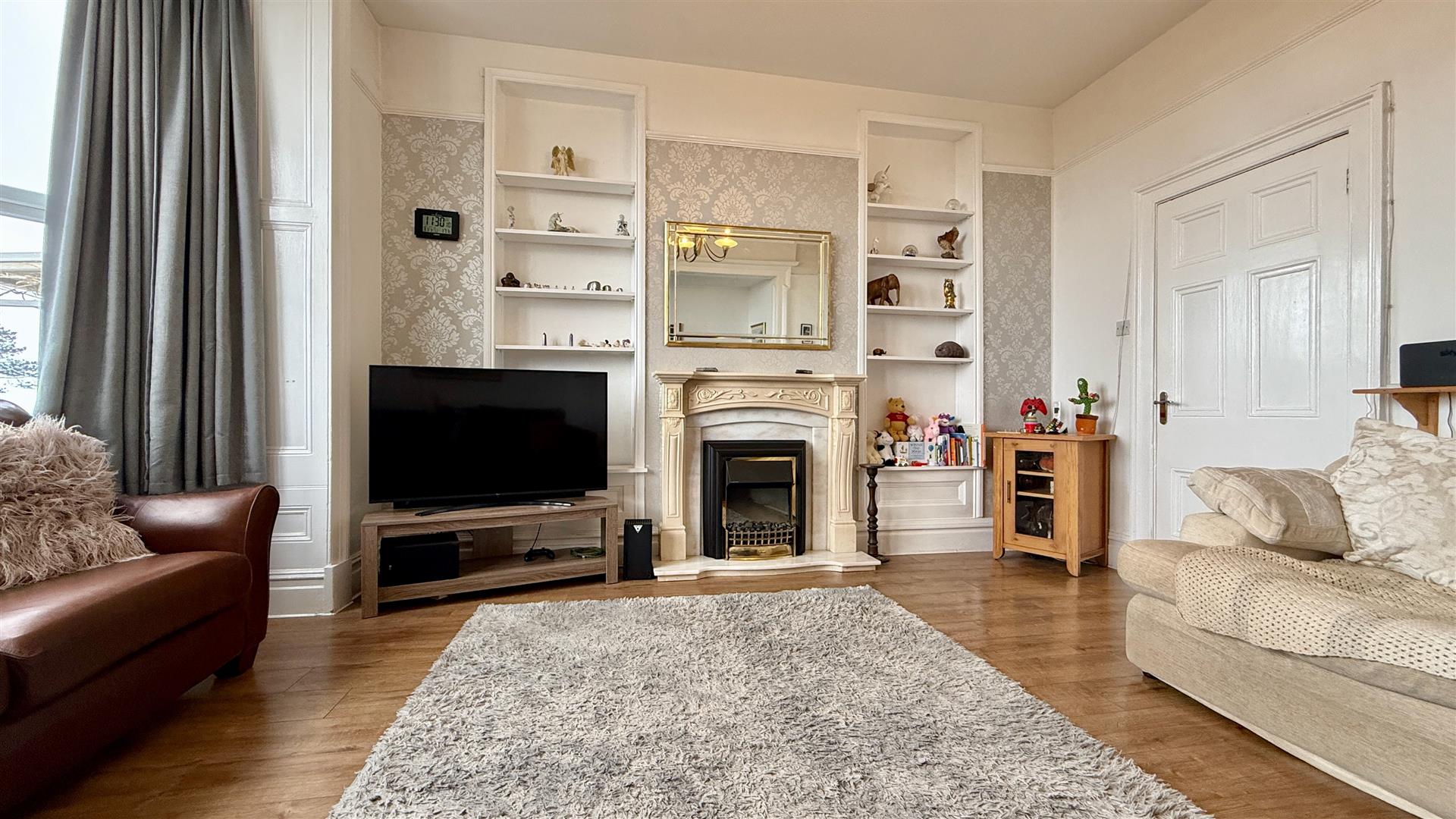 Flooded with light from the large bay window with wooden panelling which looks over the private front garden with views extending over the town to Cardigan Bay. Wood effect laminate flooring, attractive 'Marble' effect fireplace surround with real flame effect electric fire inset and shelved alcoves. Elegant with high ceilings and picture rails.