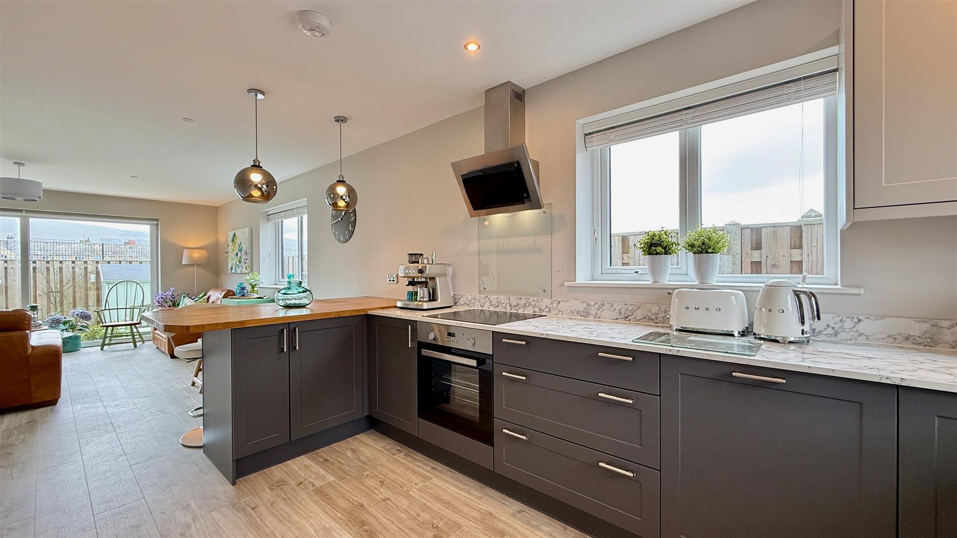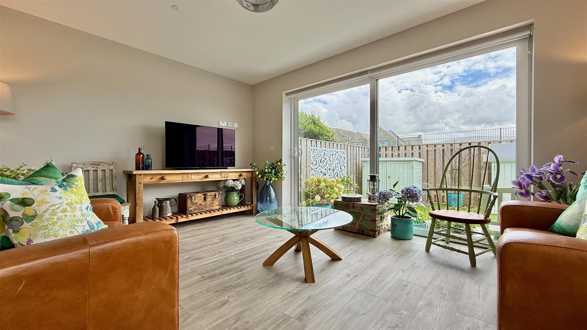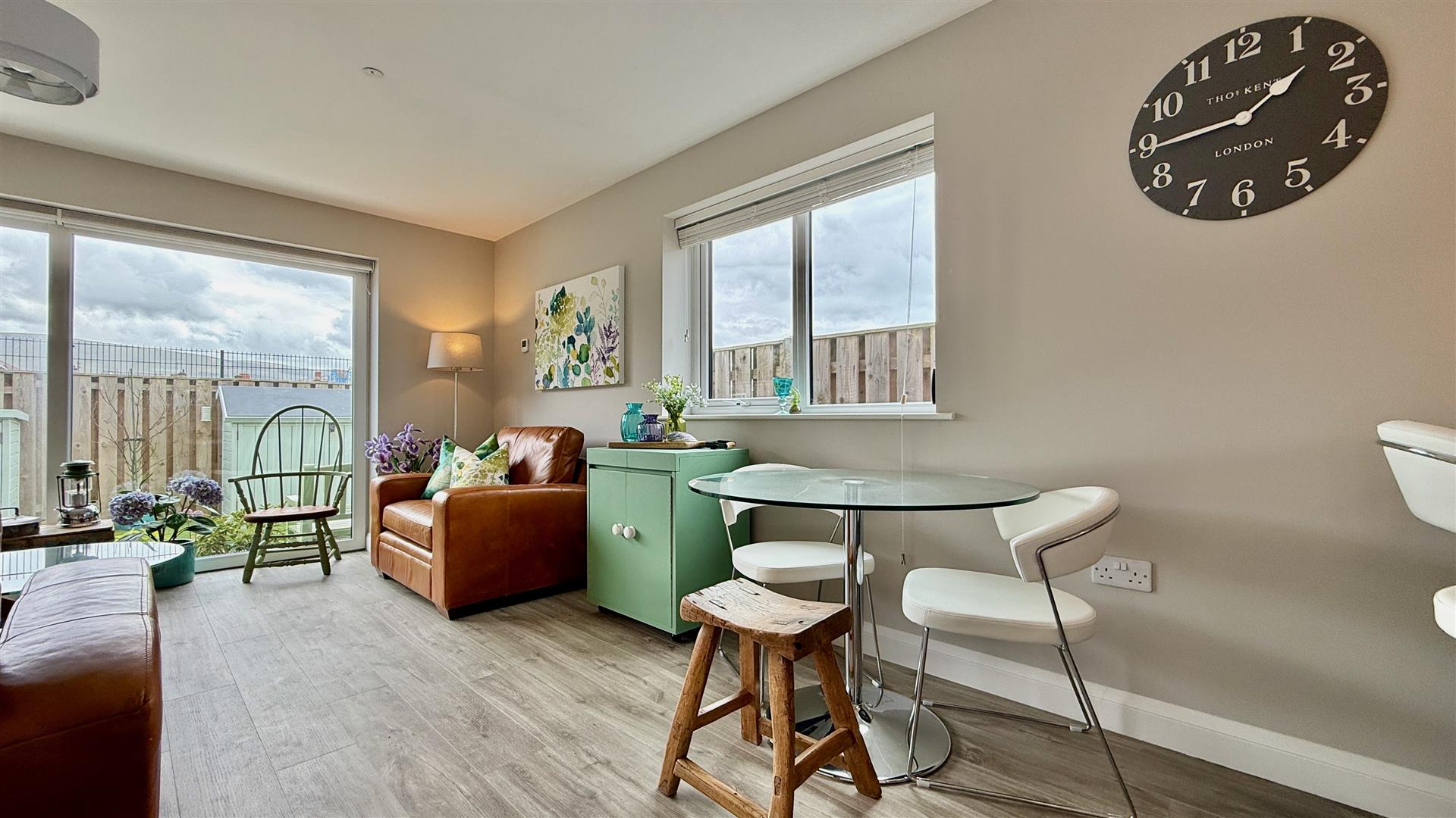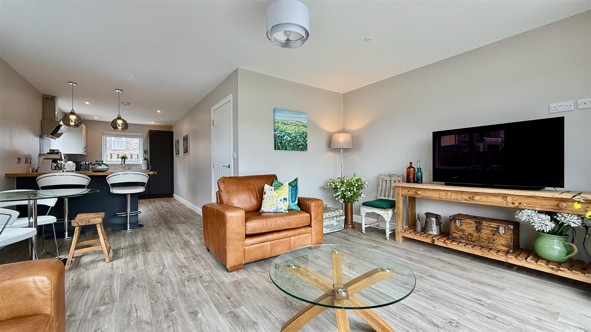 A stylish light and airy open plan space with large living area and patio doors to the garden plus window to the side with sea views. The well equipped contemporary kitchen has a solid oak breakfast bar. There is space for a dining table and chairs, underfloor heating and wood effect laminate flooring throughout.