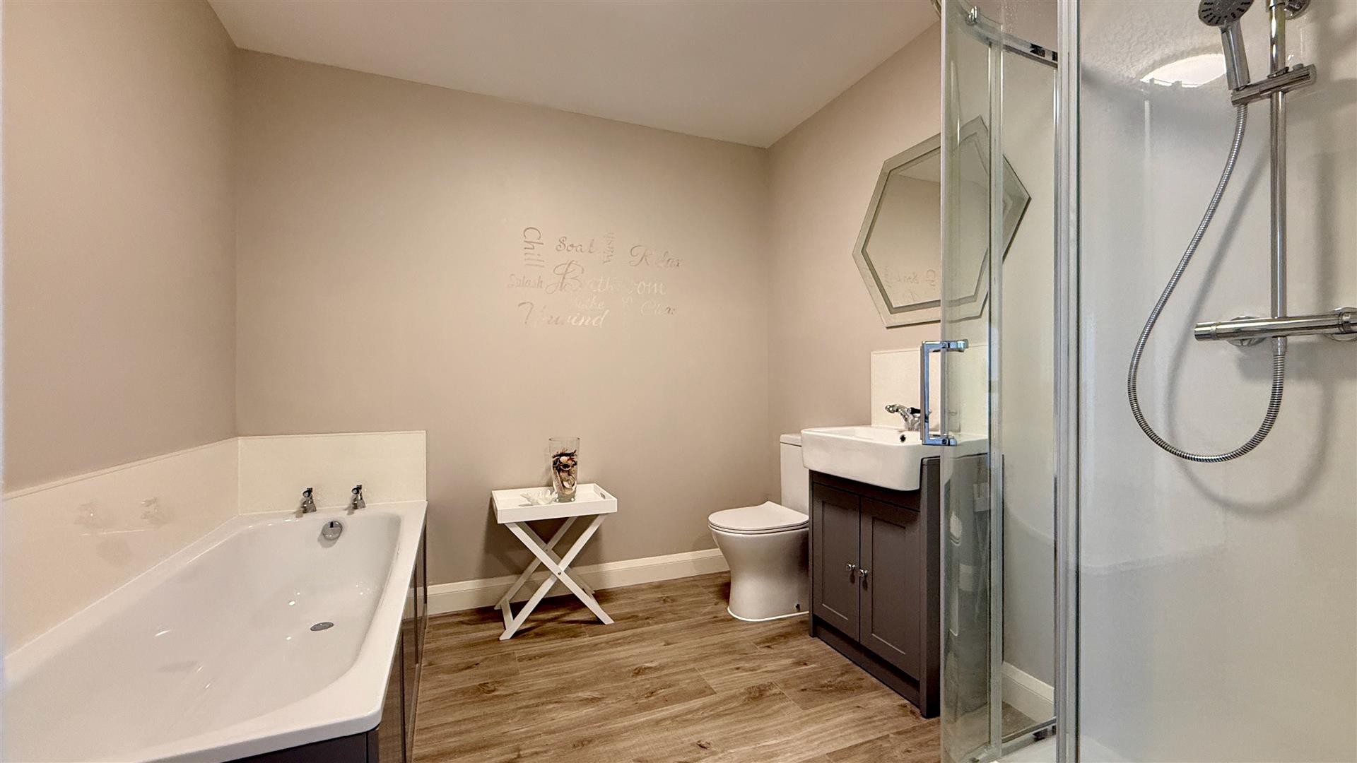 Servicing the two bedrooms on the first floor, this luxurious bathroom benefits from a panelled bath, corner shower unit with power shower, hand basin in vanity unit and low level WC. With heated towel rail and wood effect laminate flooring.