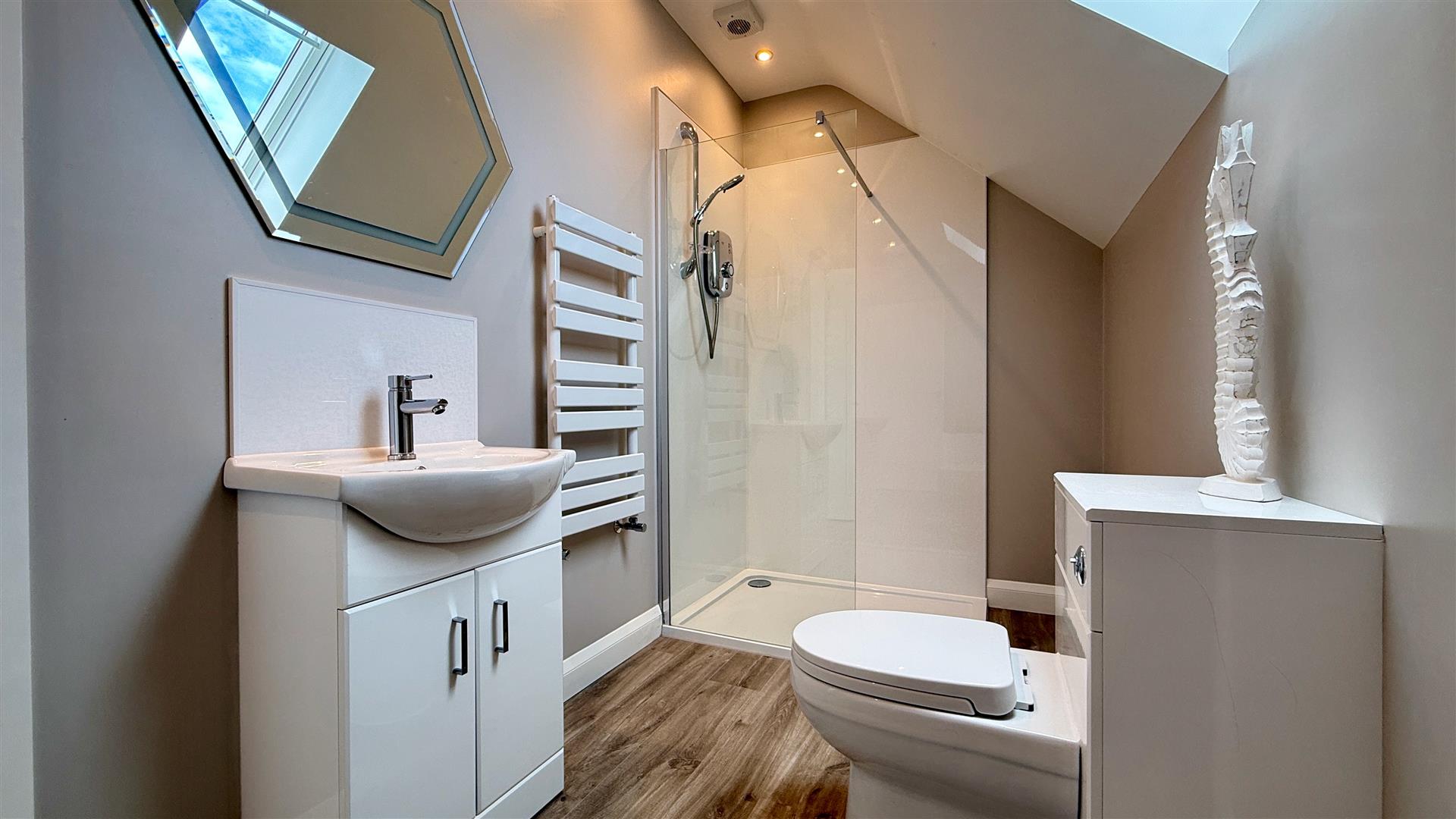 With walk in shower cubicle, hand basin in vanity unit, low level WC, heated towel tail and Velux window. Wood effect laminate flooring and two built in storage cupboards.
