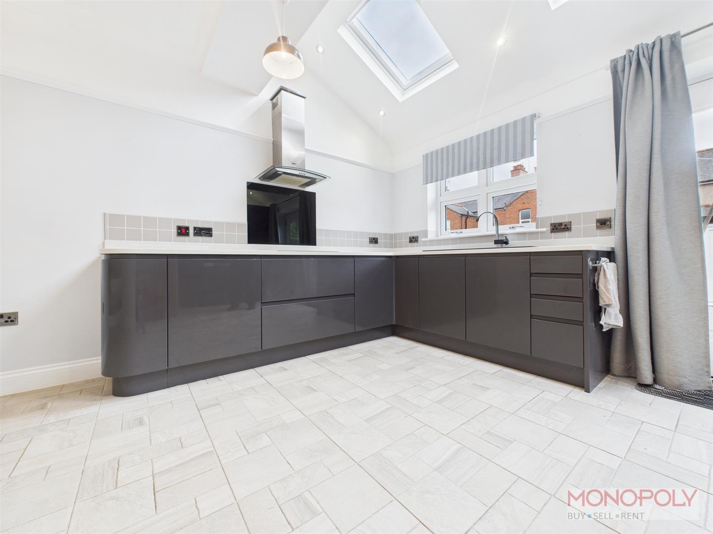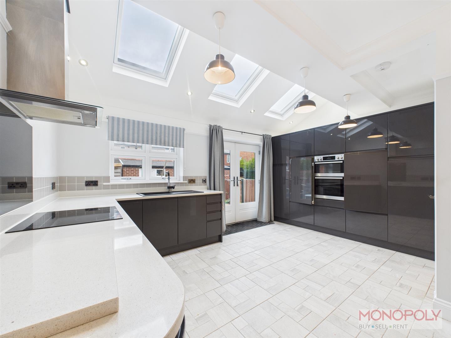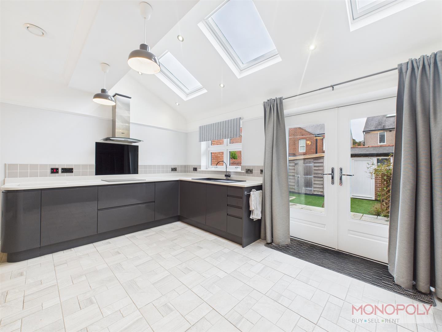 Housing a range of modern wall, drawer and base units with Silestone work surface over. Integrated appliances to include fridge, freezer, eye-level double oven and grill, induction hob and extractor over. Composite sink unit with mixer tap over. Continuation of tiled flooring, recessed LED lighting, three pendant lights, under-floor heating, space for dining table and fitted shelving, three Velux sky lights, uPVC double glazed window to the rear and uPVC double glazed French doors to rear garden area.