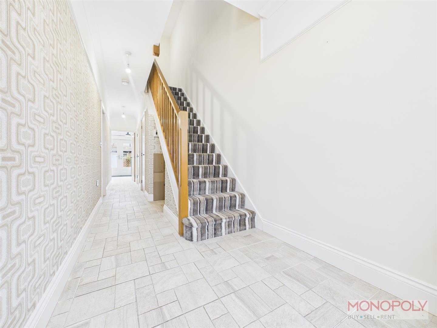 Composite doors leads into spacious entrance hallway with tiled flooring, twio ceiling light point, cupboard housing meters, under-stairs cloak area, doors leading into living room, downstairs WC, utility and kitchen/dining area.