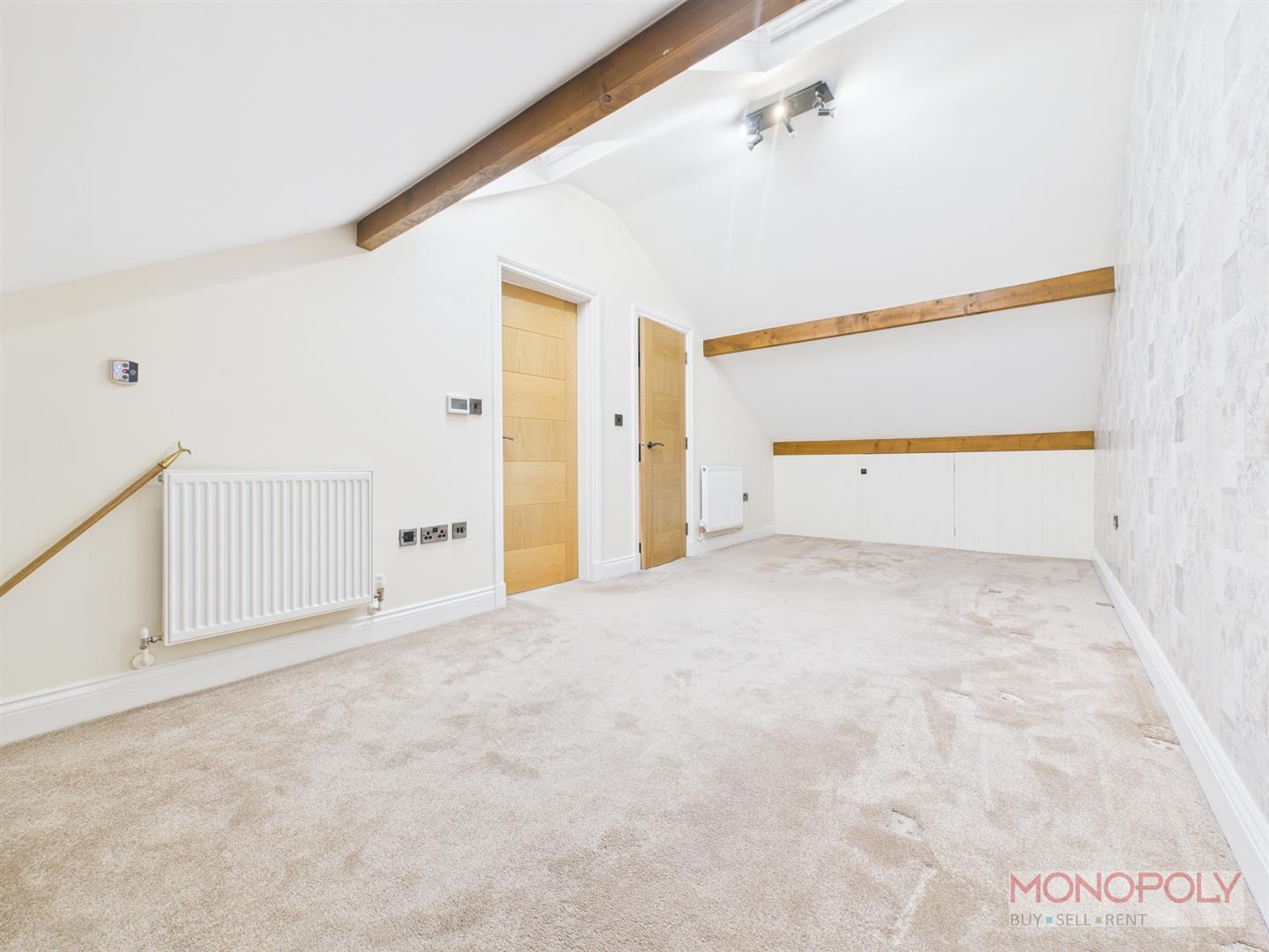 Spacious loft conversion with two Velux sky lights, carpet flooring, eave storage cupboards either side with lighting, beamed ceiling, two panelled radiators and door into en-suite.