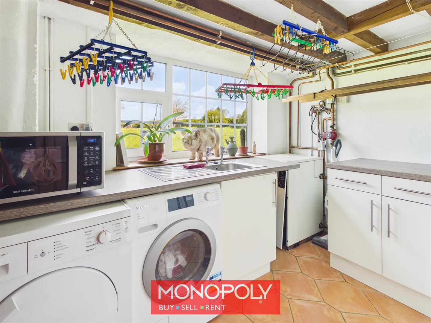 A highly practical space with stainless steel sink, worktops and storage, along with plumbing for washing machine and dryer. The oil boiler and water tank are housed here, and a large window frames attractive countryside views.