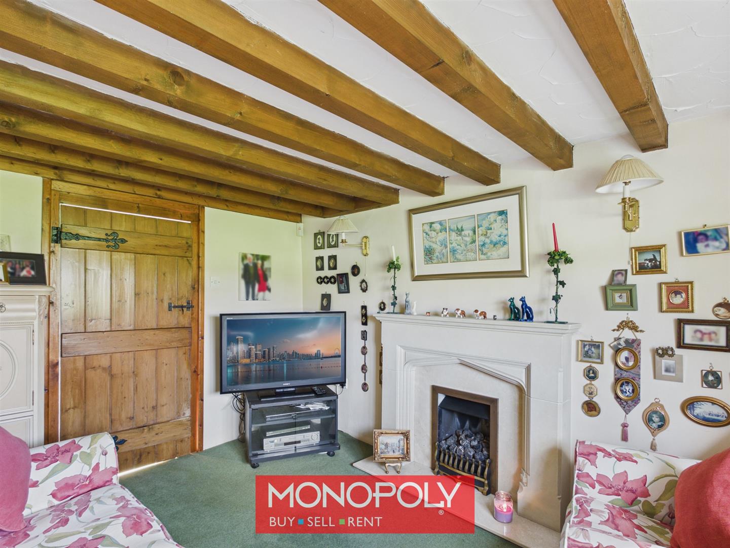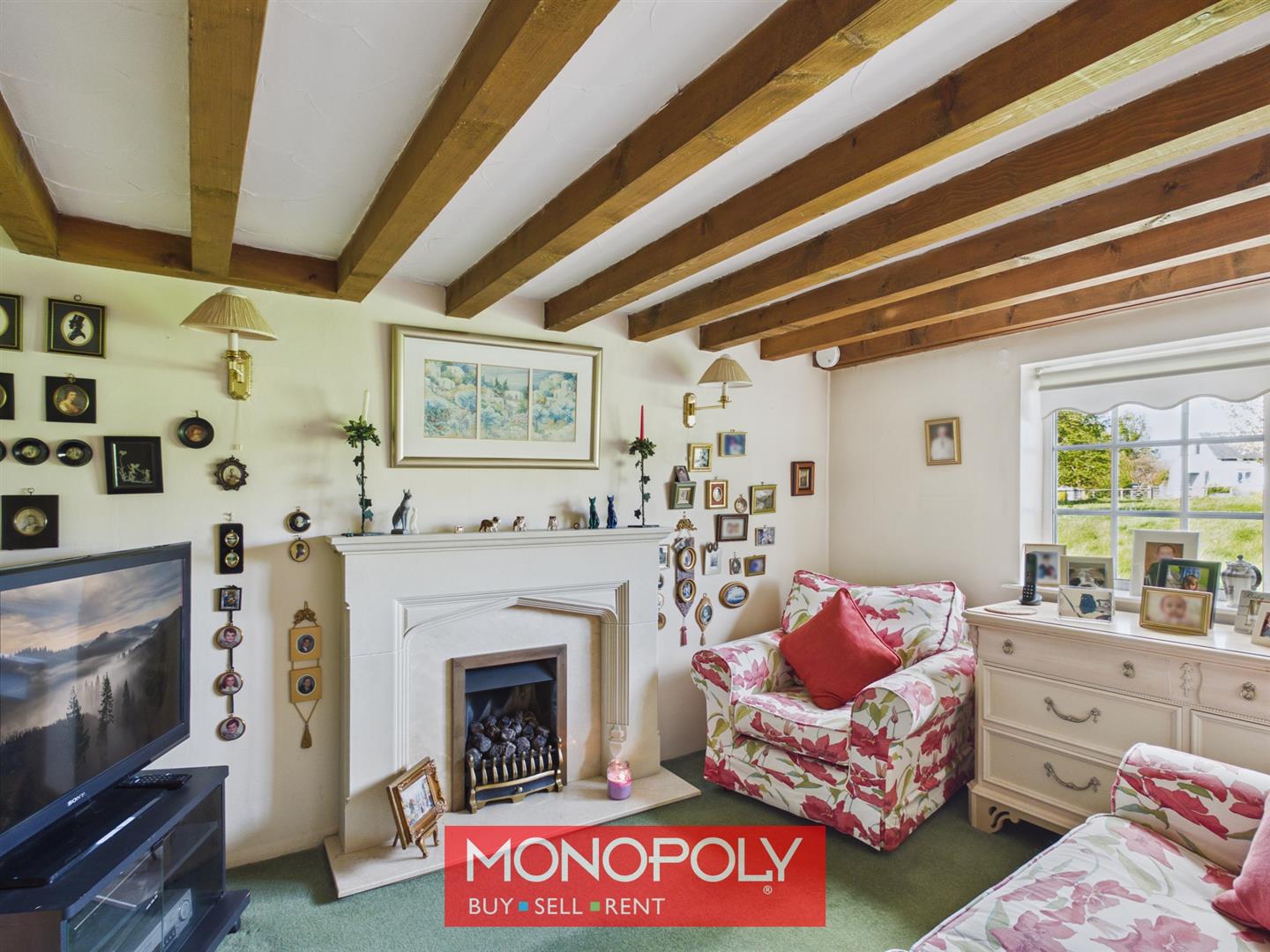 A cosy and characterful reception room featuring a stone-effect fireplace with gas fire, exposed ceiling beams and a window to the side elevation. A perfect retreat or informal sitting room.