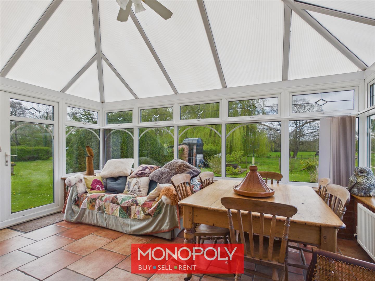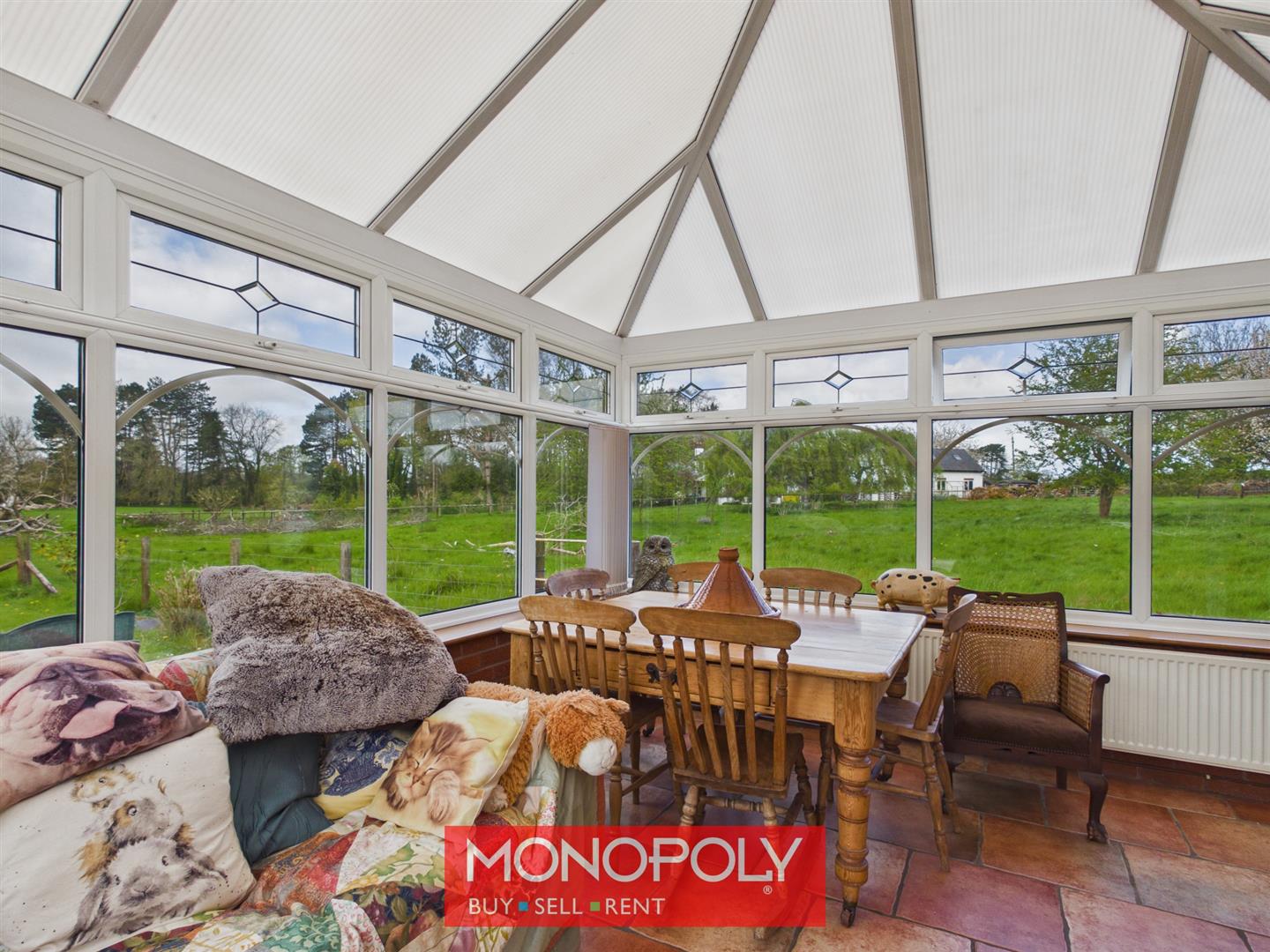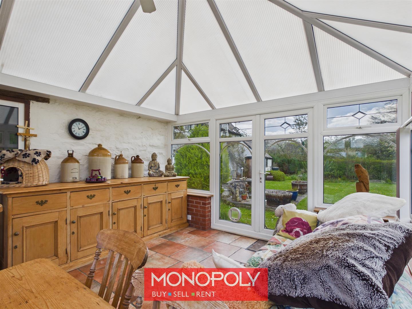 A bright and spacious addition with tiled flooring and a polycarbonate roof, enjoying uninterrupted views over the garden and surrounding countryside. French doors connect to the kitchen, with an additional external door providing garden access.