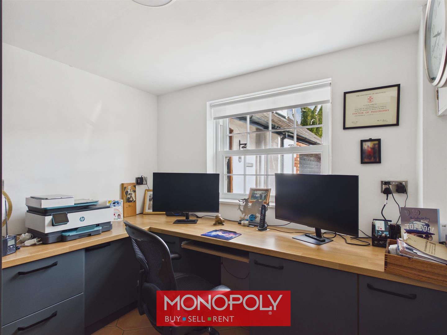 A versatile ground floor room with tiled flooring, fitted storage, shelving and a window overlooking the rear. Ideal for home working or study use.