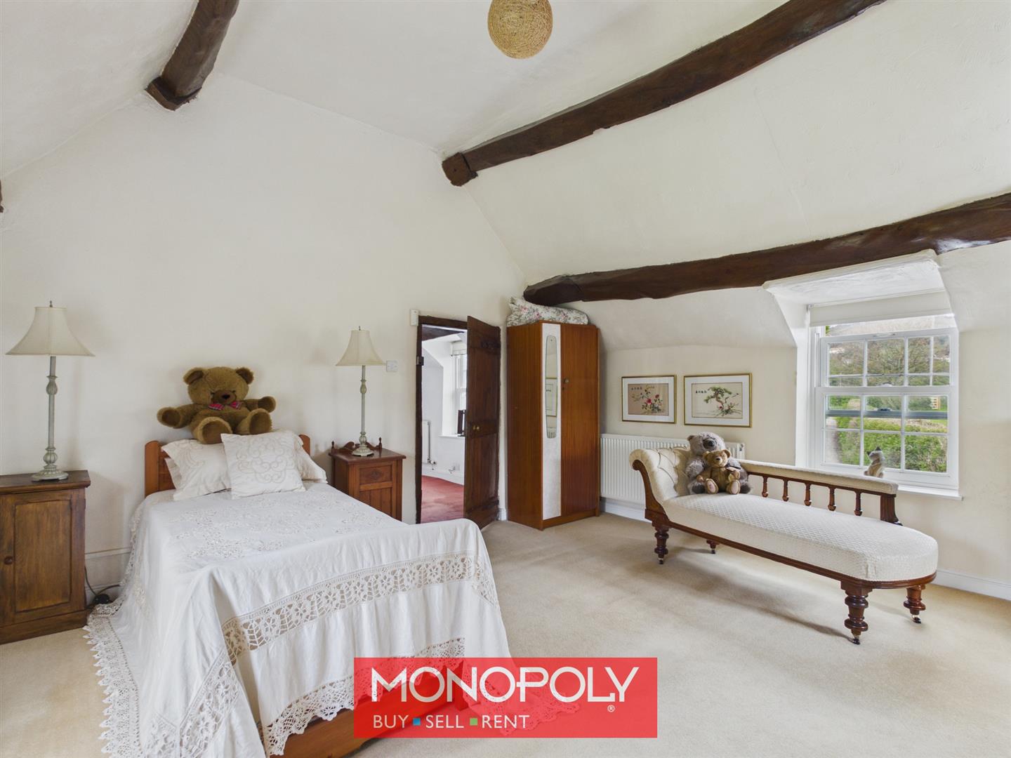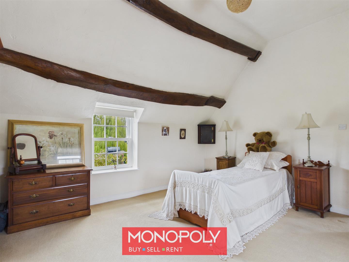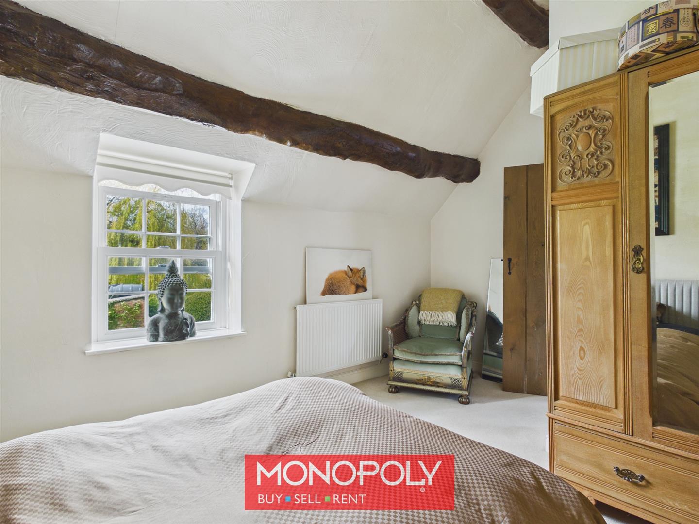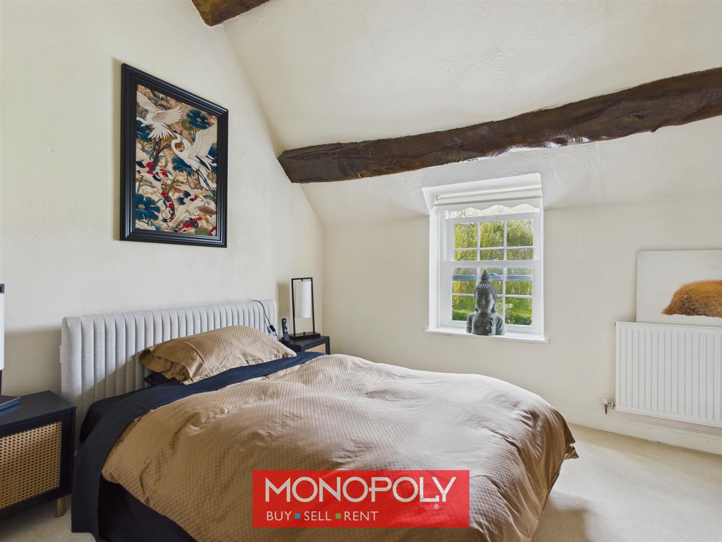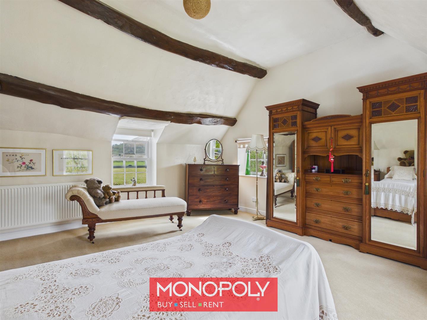 A generous double bedroom with high ceilings and exposed beams, overlooking the rear garden, with additional decorative window detail to the front and ample space for storage.