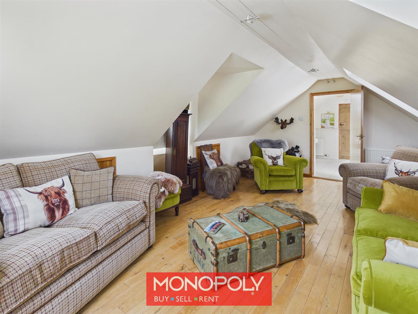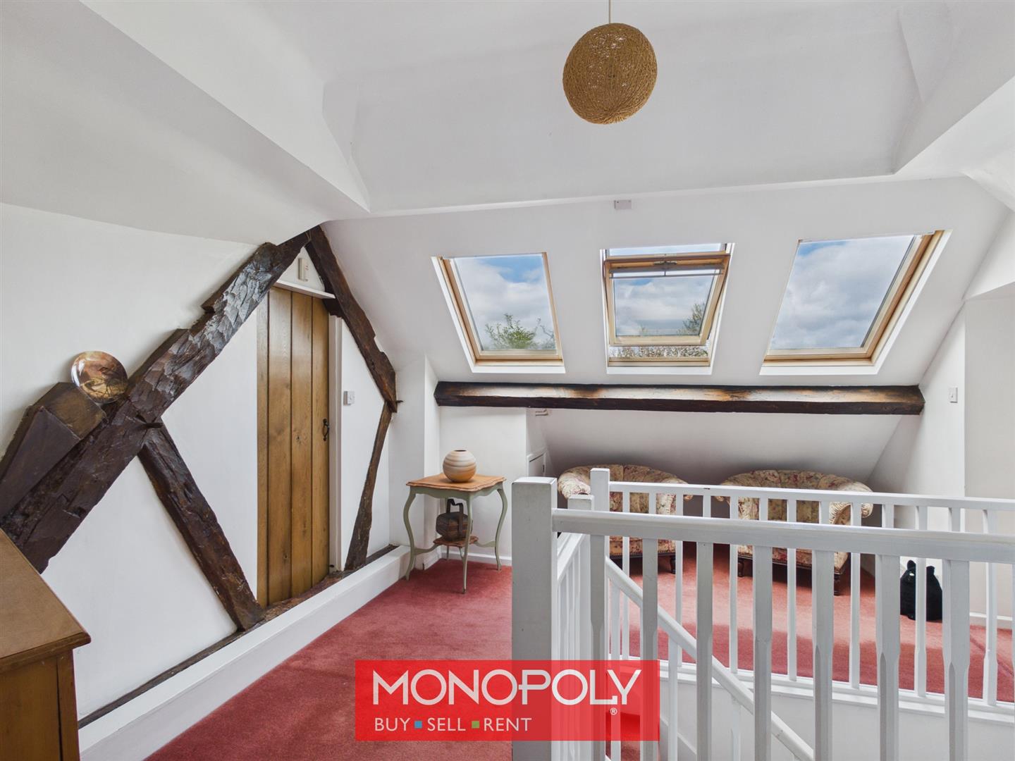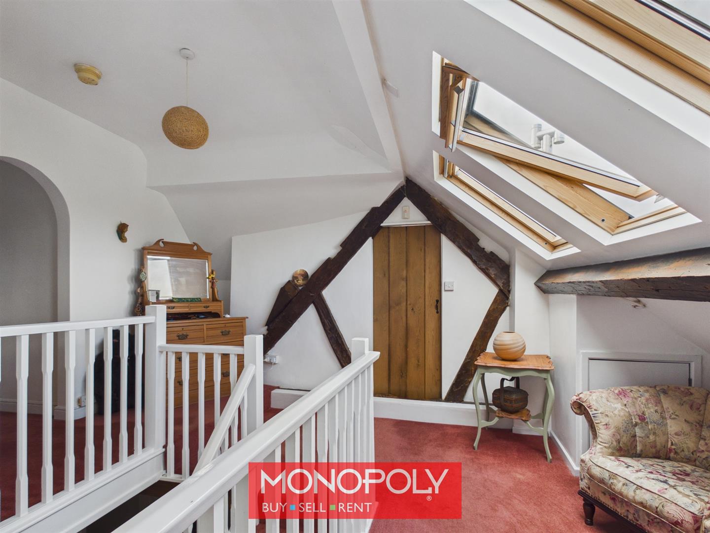 A unique Z-shaped landing with three skylights allowing natural light to flood the space. Offering multiple storage cupboards and access into the eaves, with a step leading up to the bedroom areas.