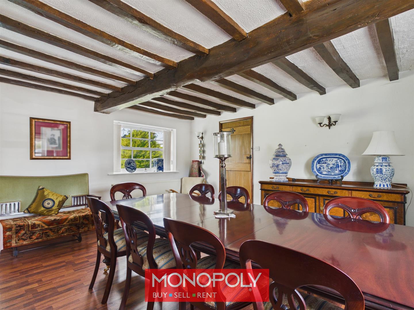 Stepped down from the hallway, this generously sized dining room enjoys a dual aspect with windows to the front and rear, alongside charming arched feature windows. Finished with wood-effect flooring and exposed beams, the room comfortably accommodates a large dining table for entertaining.