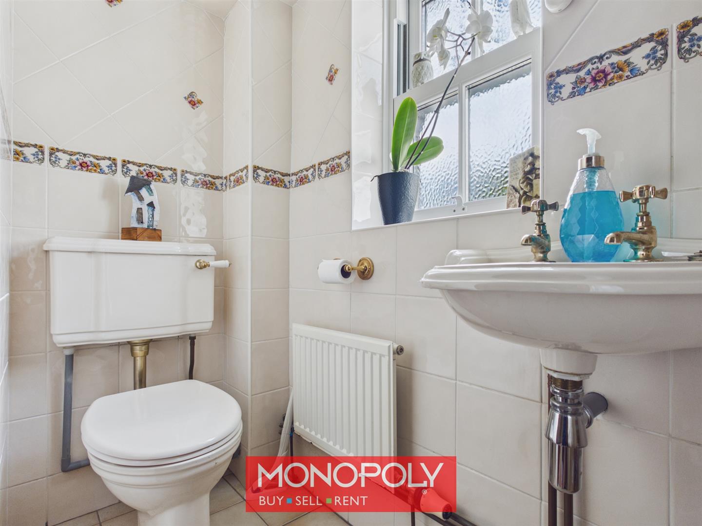 A Victorian-style suite comprising a wall-mounted sink, WC and walk-in shower with electric unit. Finished with tiled flooring, decorative wall tiling and a privacy window.