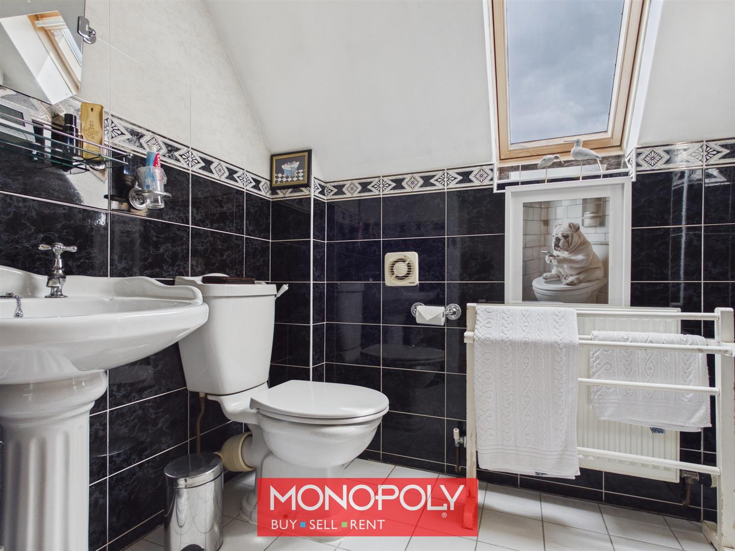 Stylish black and white suite with tiled flooring, column-style sink, WC and generous shower enclosure with thermostatic shower, finished with a skylight.