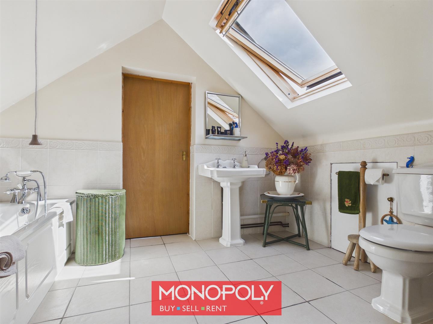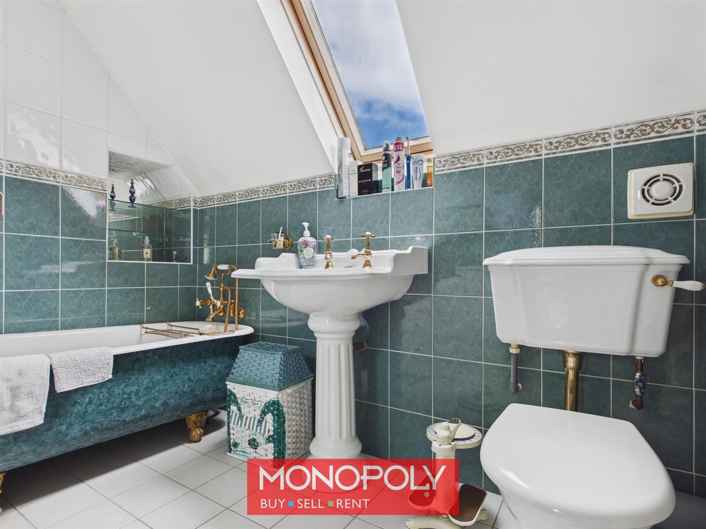 Characterful bathroom featuring a claw-foot bath, pedestal sink and WC, with tiled flooring, decorative detailing and skylight.