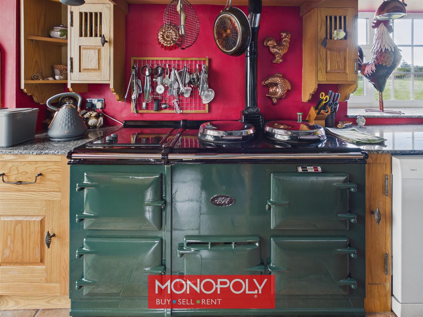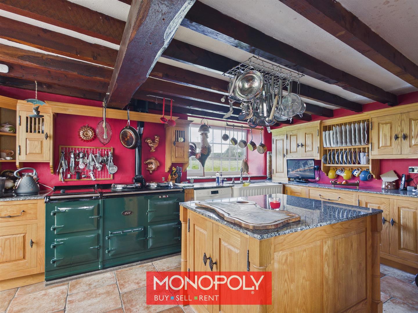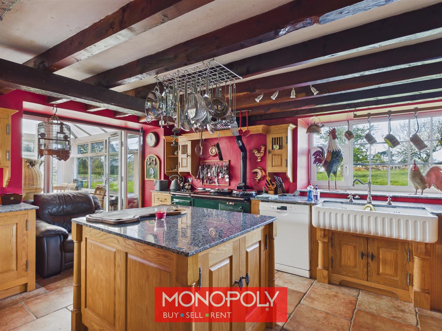 A traditional yet well-equipped kitchen fitted with a range of wooden units and granite worktops, complemented by a central island offering additional storage. Features include a green Aga, twin sink, pantry cupboard and space for an American-style fridge freezer. French doors lead directly into the conservatory, creating a sociable flow.