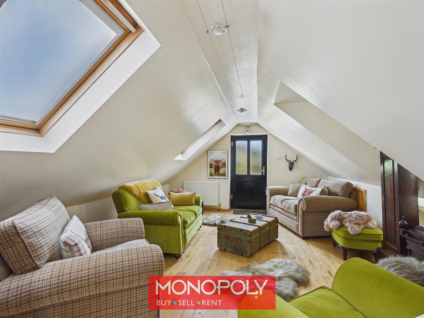 A flexible bedroom with oak flooring, multiple skylights and access to the outside via a stone staircase. Currently used as a secondary lounge, but could also be a granny annex or air bnb for potential guest space with slight adjustments.