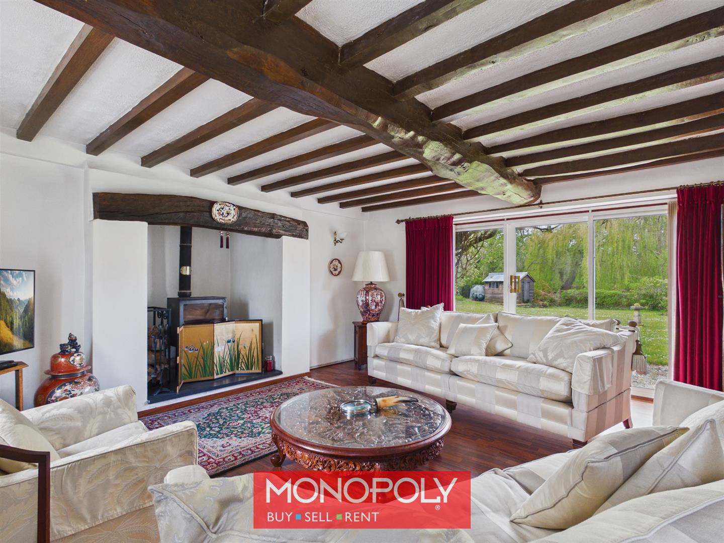 A truly spectacular main lounge boasting a striking inglenook fireplace with multi-fuel burner set on a slate hearth with an attractive timber beam above. The room is flooded with natural light via dual aspect windows and sliding patio doors opening onto the rear garden, with exposed beams enhancing the overall character.
