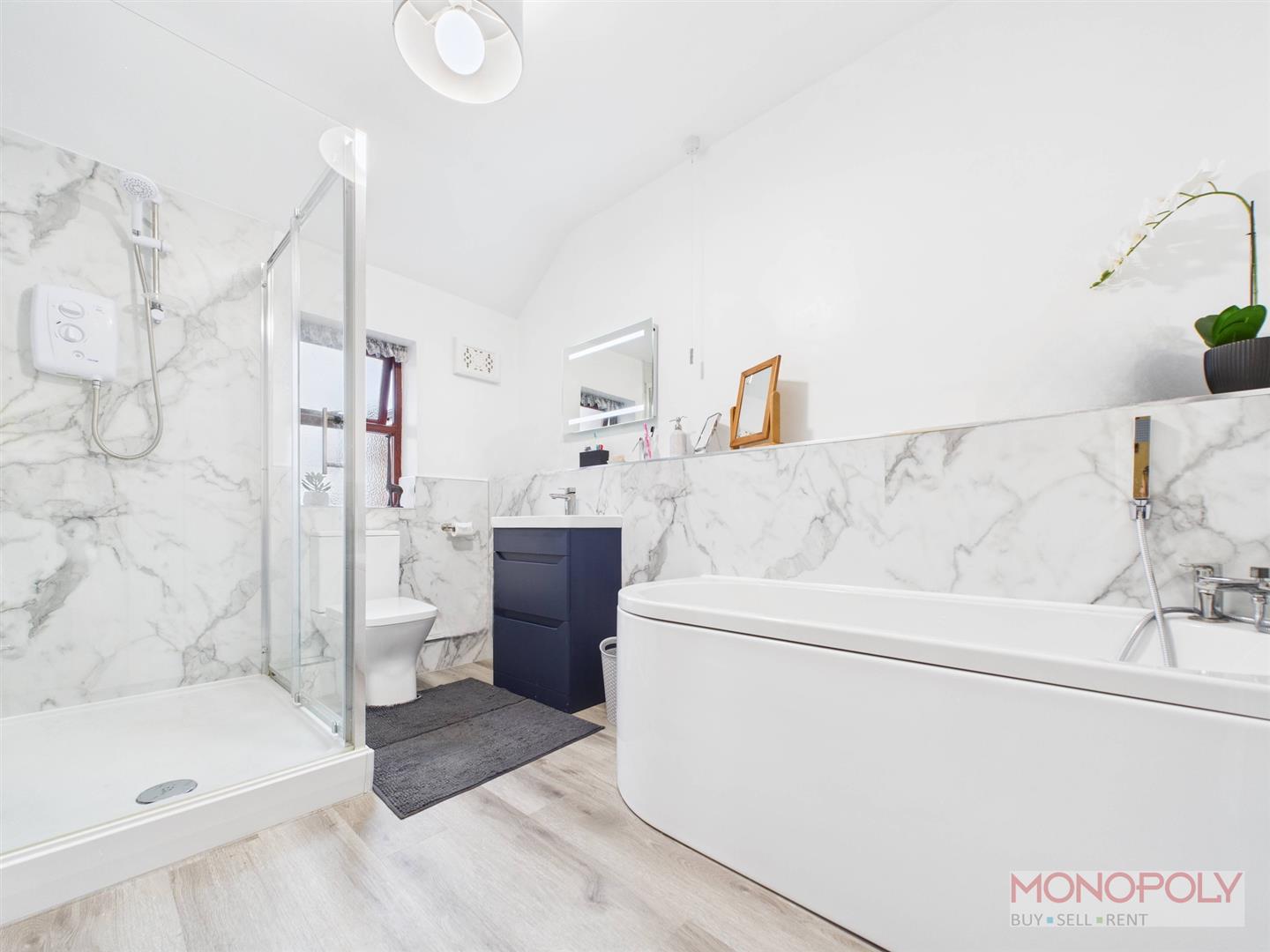 Modern four piece family bathroom with low-level WC, wash hand basin, panelled bath with shower hose and separate walk in shower cubical with electric shower. PVC panelled splash-back, extractor, ceiling light point, heated towel rail and wooden window to rear.