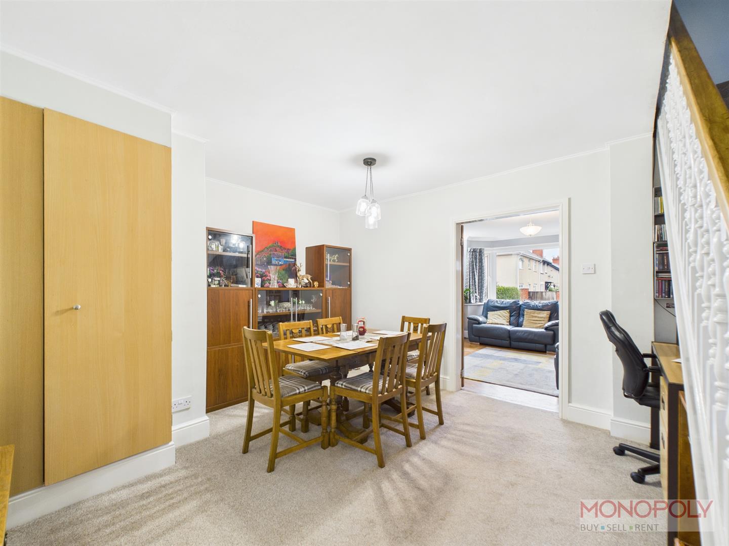 Two wooden double glazed windows to the side elevation. Built in cupboard with shelving, under-stairs office area with bespoke pull out storage, carpet flooring, panelled radiator, ceiling light point and stairs rising to first floor.