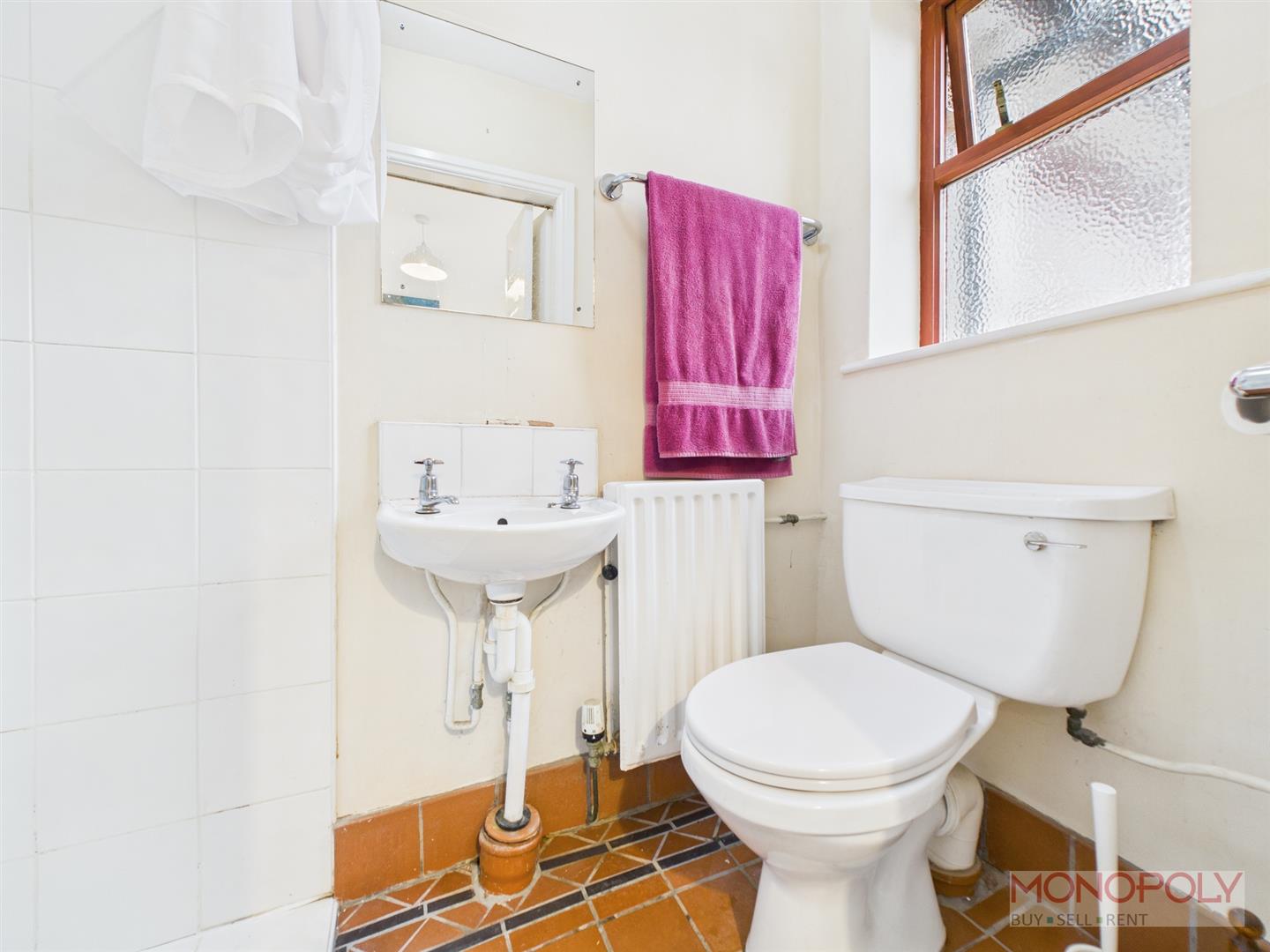 Three piece suite comprising low-level WC, wash hand basin and walk in shower. Tiled flooring, ceiling light point, extractor, radiator and wooden glazed and frosted window to the rear.