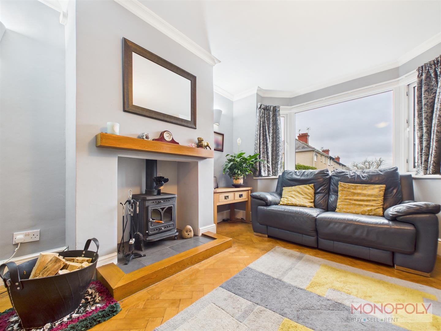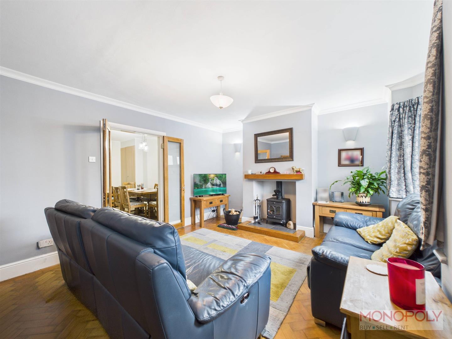 UPVC double glazed entrance door leads into living room with uPVC double glazed window to the front. Multifuel burner set on a slate tiled hearth with wooden mantle, parquet wood flooring, two wall lights, ceiling light point, panelled radiator and wooden glazed French doors to the dining room.