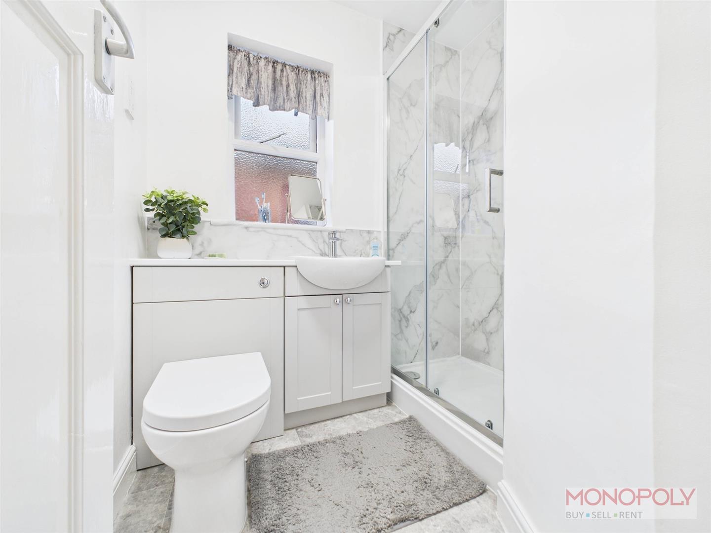 Three piece modern suite comprising a low-level WC with concealed cistern, wash hand basin with storage and walk in electric shower cubical. Vinyl flooring, heated towel rail, shave point, extractor and window to side.