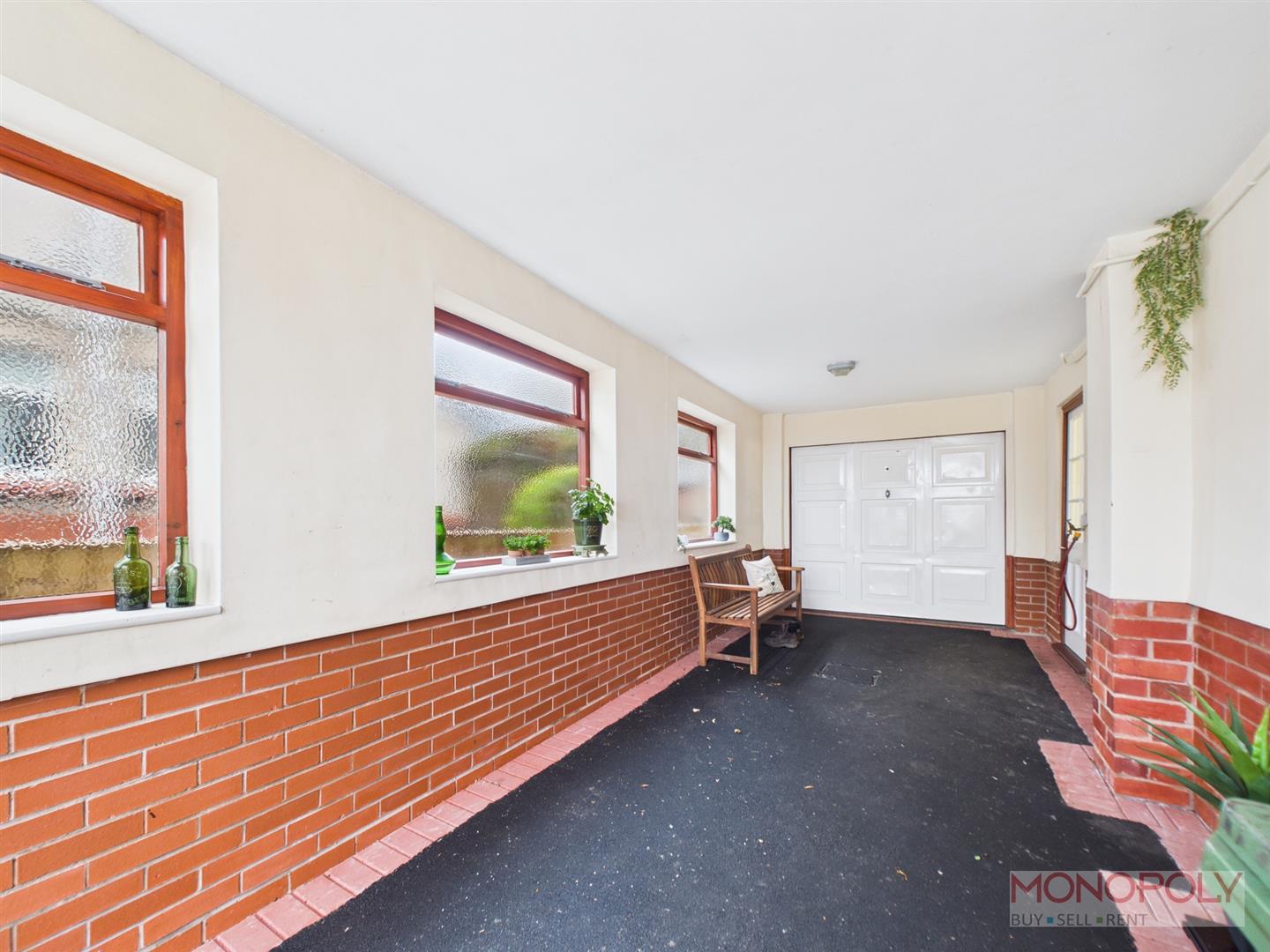 A sheltered carport with three windows to side and lighting leads to a garage with up and over door. The garage has power, lighting, stainless steel sink unit and built in workshop shelving to the rear of the garage along with two windows and additional wooden double doors providing access to the rear garden.