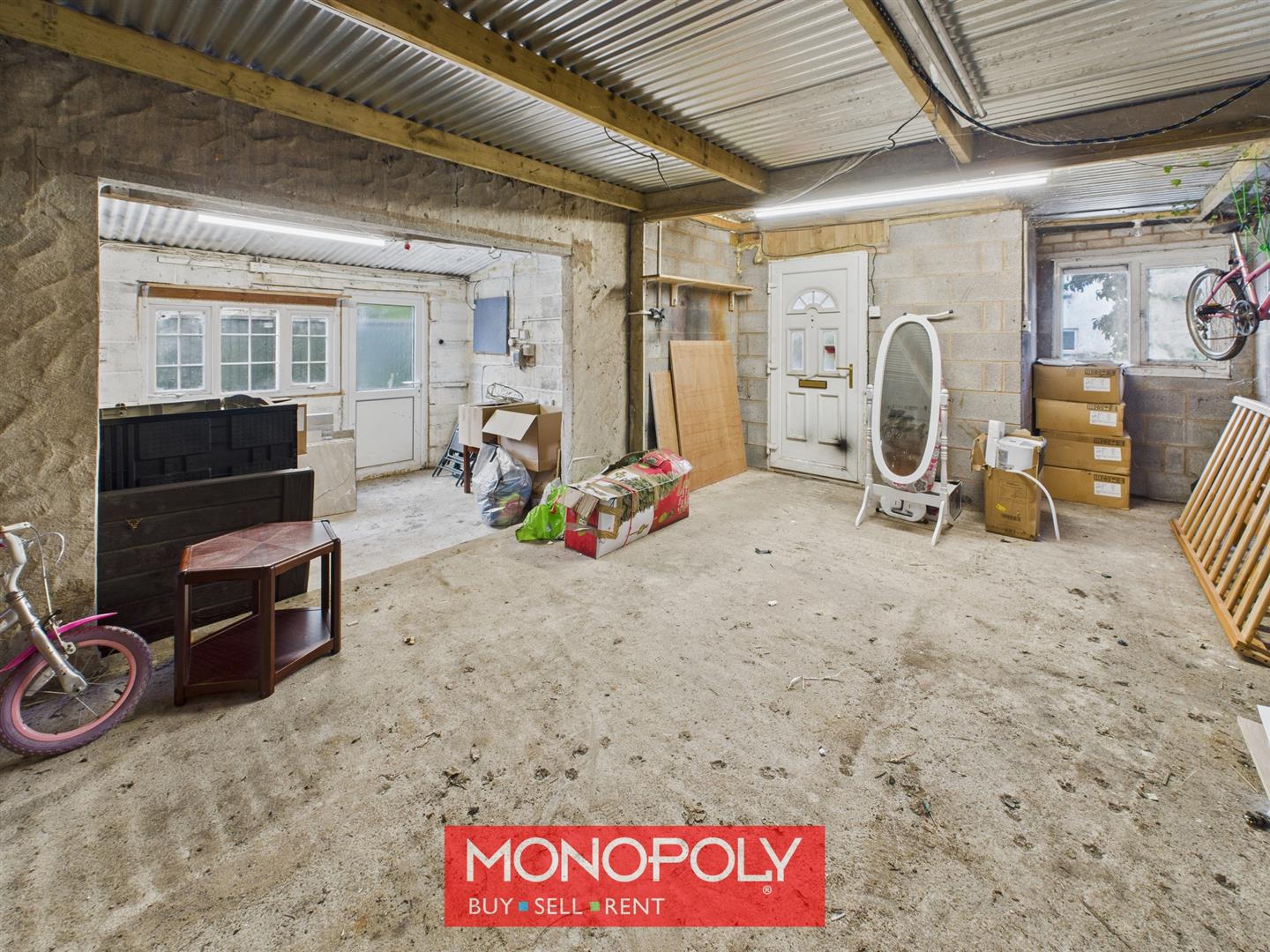 A large double garage with up-and-over entrance to the left and timber doors to the right. Complete with concrete flooring, uPVC pedestrian doors to the side and rear, electric lighting, and sockets. One half features a tin roof and the other an asbestos roof, offering generous storage and workshop space.