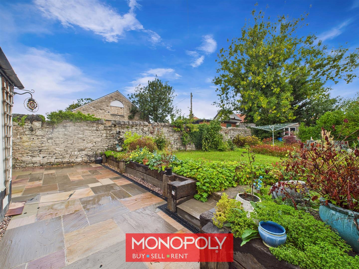 The rear garden is a lovely outdoor space, recently landscaped with an Indian stone patio and eco-drain. A lawned area is surrounded by mature shrubs, plants, and fruit trees including apple and pear. A concrete path leads to the double garage and parking area, while the garden is enclosed with a wall to one side and hedging to the other. A small timber shed is also included.