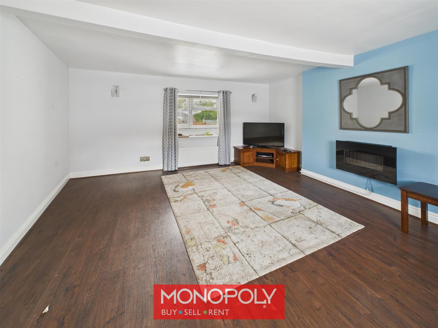 A bright and welcoming lounge with dual-aspect uPVC double-glazed windows to both the front and rear, filling the room with natural light. Finished with laminate flooring and a wall-mounted feature fire, this space offers a comfortable setting for relaxing. Electrical points are conveniently placed throughout.
