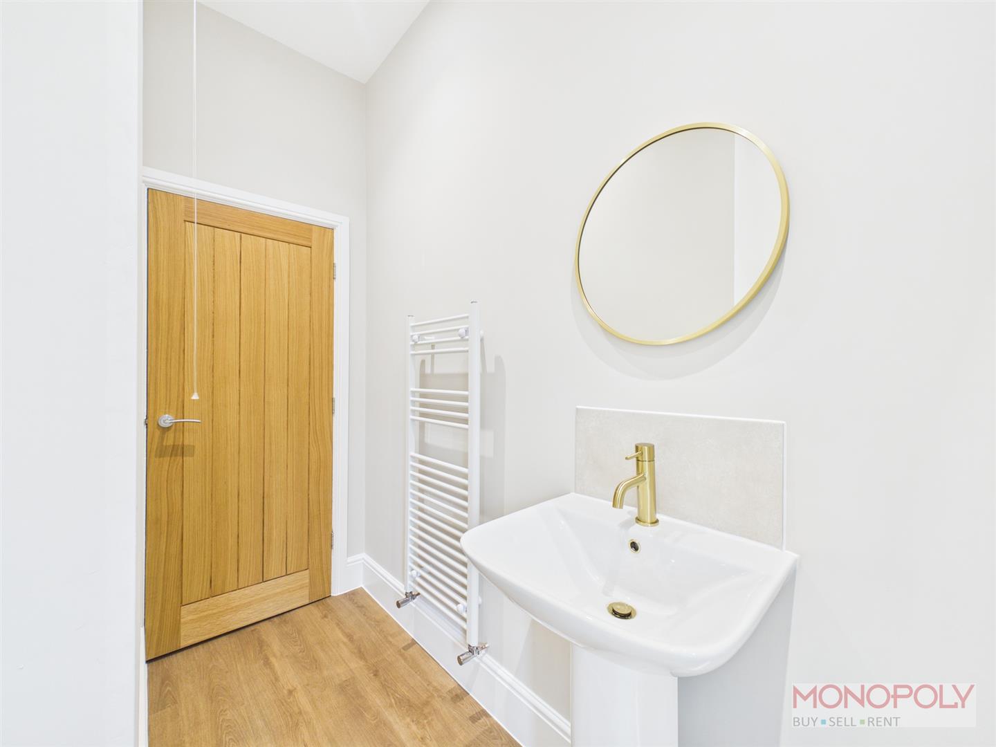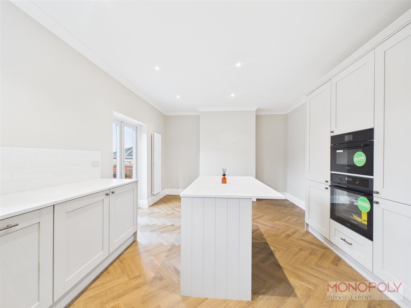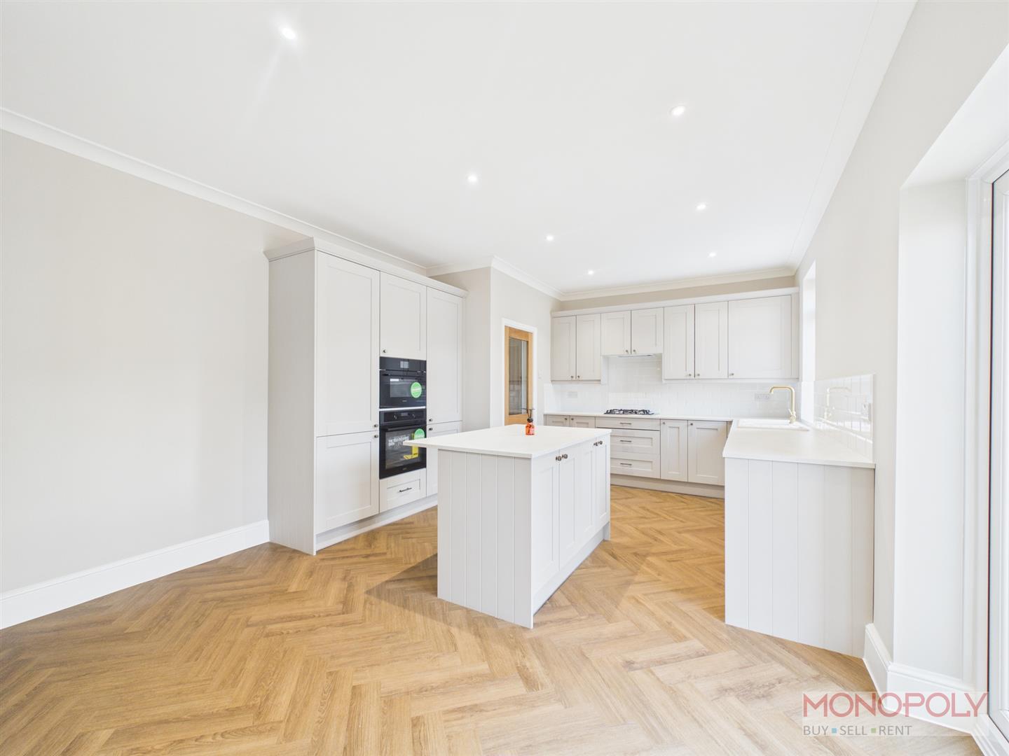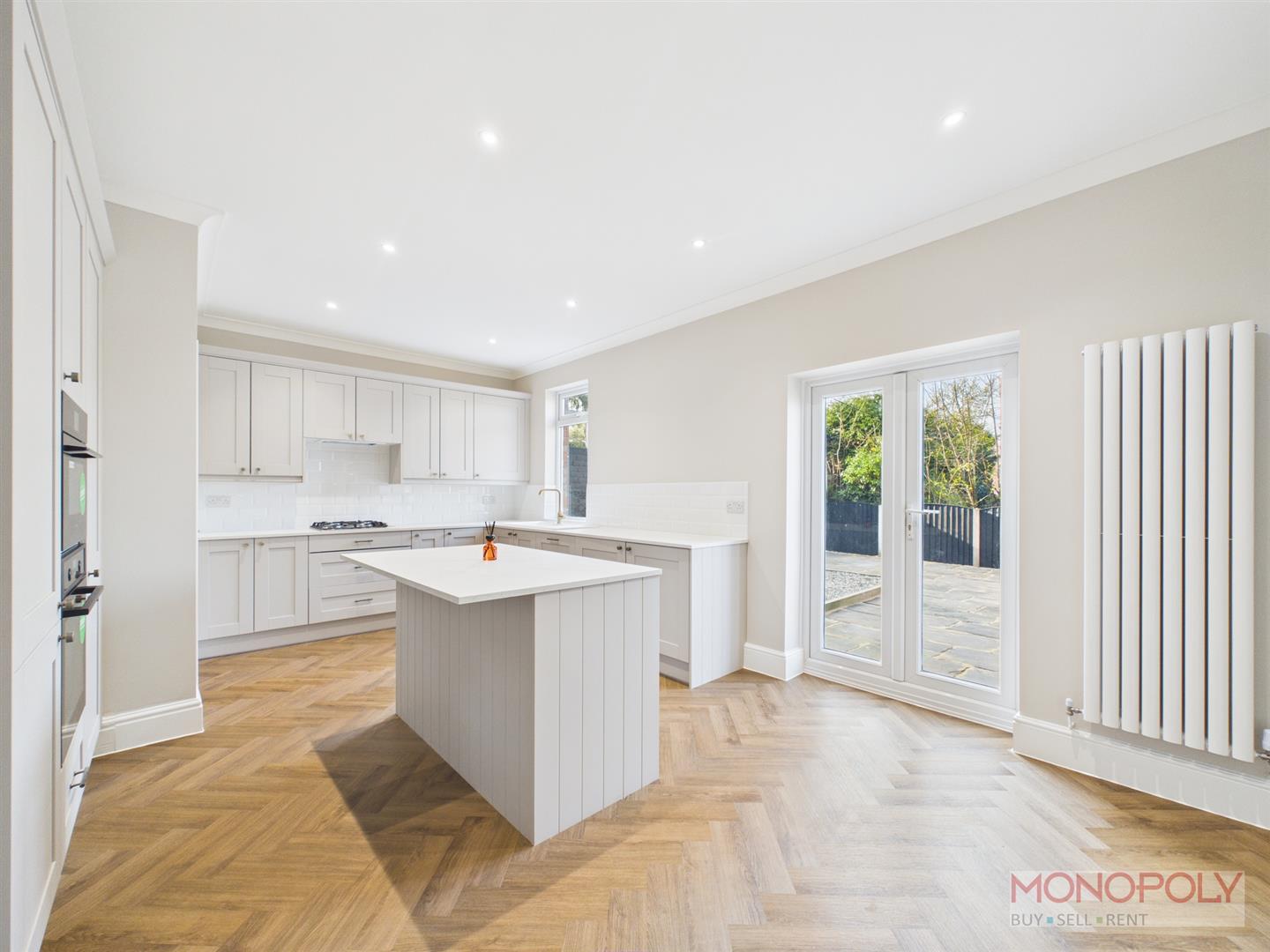 Fitted with a stunning range of wall and base units, central island, complementary worktops, gas hob, extractor, oven and grill, inset sink with mixer tap, window to rear, French style doors to rear garden. Contemporary vertical wall radiator, timber effect flooring, integrated dishwasher, washing machine, fridge/freezer and a combination microwave.