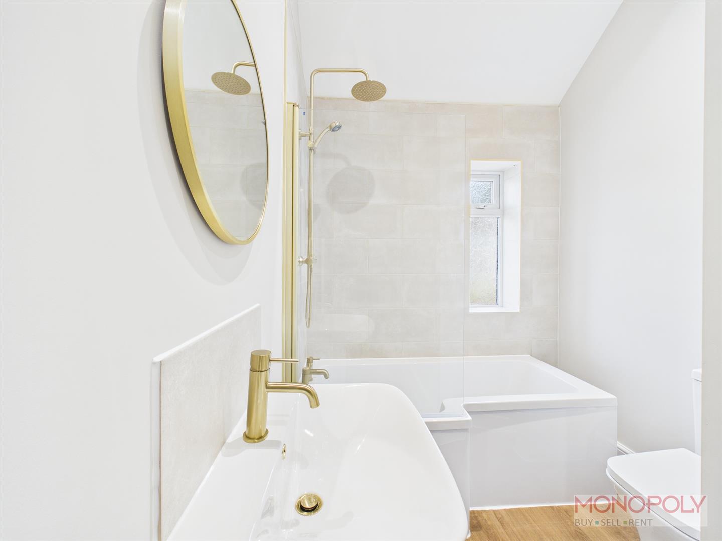 White suite comprising a wash hand basin, wc and p shape bath tub with shower screen and mains shower over, tiled splashback, timber effect flooring. Heated towel rail.