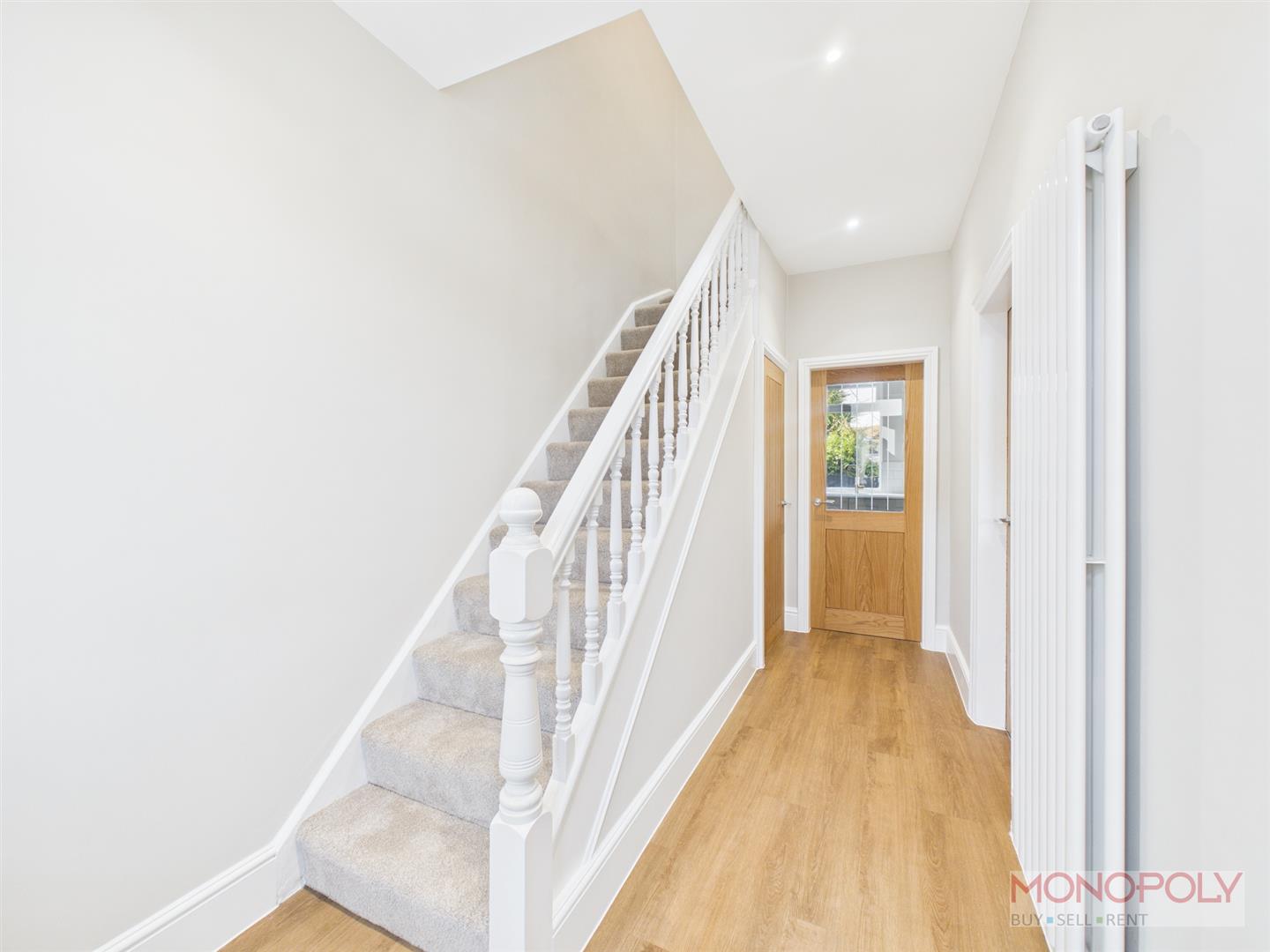 Composite entrance door, stairs rising to the first floor, doors to lounge, wc and kitchen. Contemporary vertical wall radiator. Timber effect flooring.