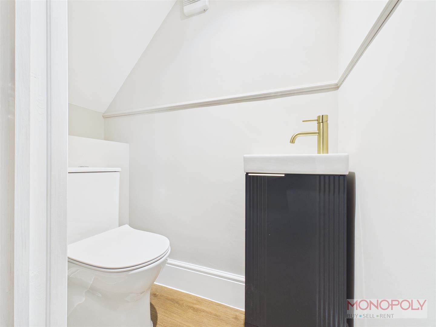 Low level wc, hand wash basin set in a vanity unit, wood effect flooring. Extractor fan.