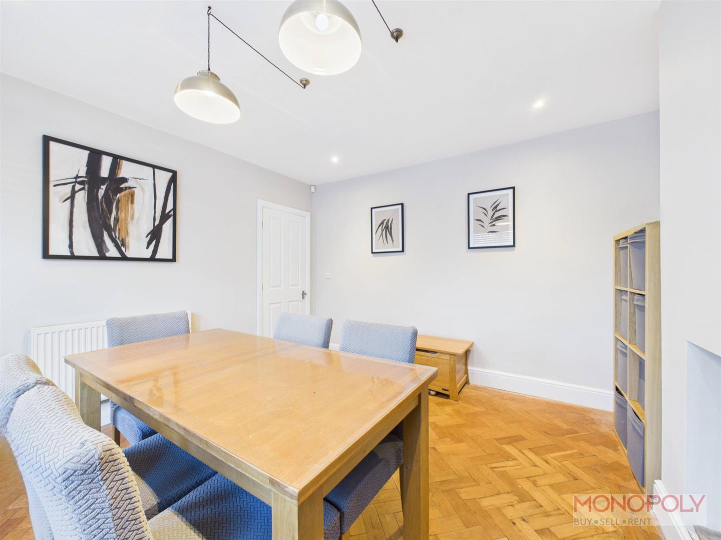 Under-stairs storage cupboard with power and window to side. Original parquet flooring, ceiling light point, panelled radiator, stairs to first floor, doors to living room, dining room and kitchen.